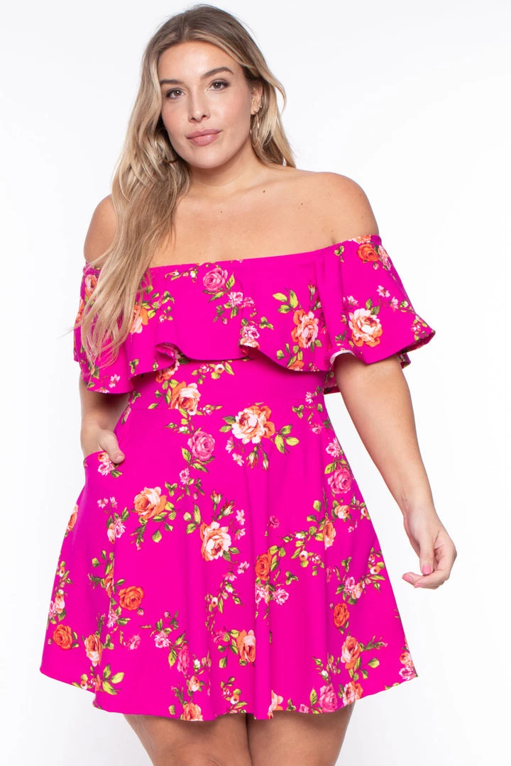 This plus size, floral print dress features an off the shoulder neckline with a ruffled hem, the dress flares out into a flirty A-line with ruffled hem and has pockets