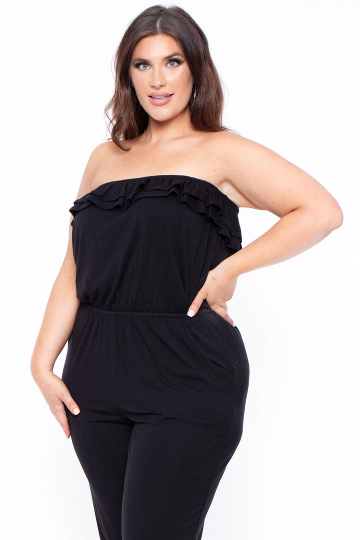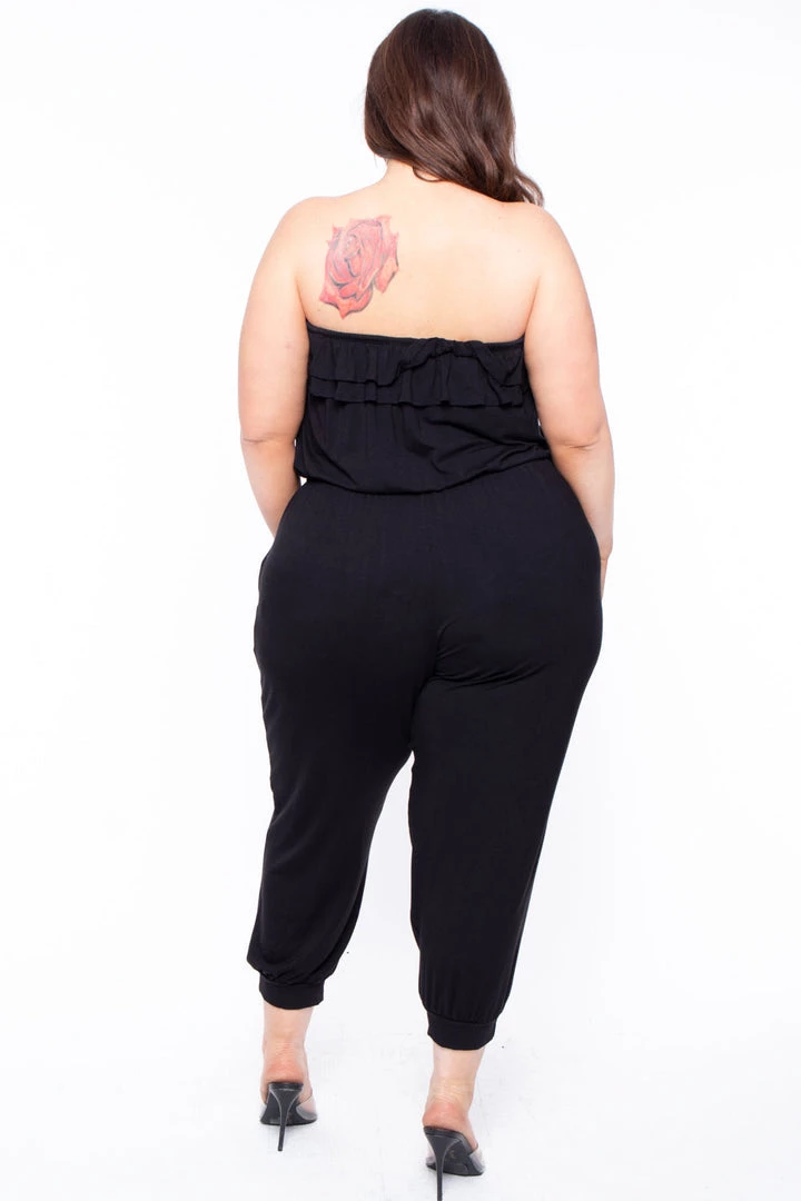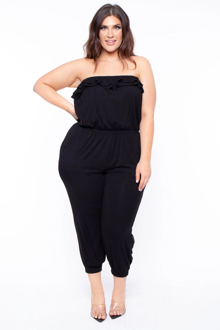 This plus size, stretch knit jumpsuit features a sleeveless neckline with a ruffle detailing, pleating, an elasticized waist, front side pockets, a relaxed fit, and a cuff at bottom hem.