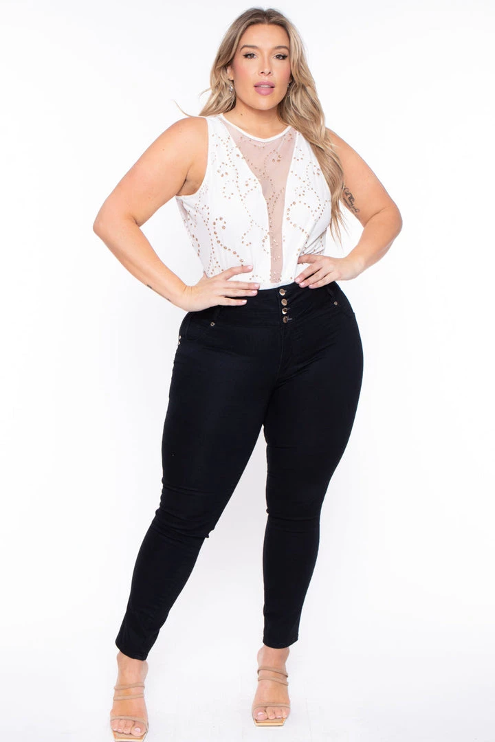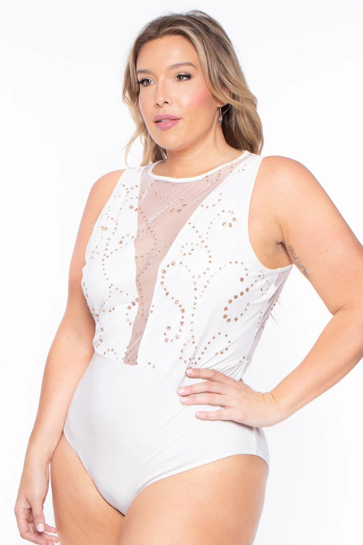 This plus size, bodysuit features an all over metallic glitter design, deep v mesh inset, sleeveless, keyhole back wit dome button closure, bodysuit double snap closure