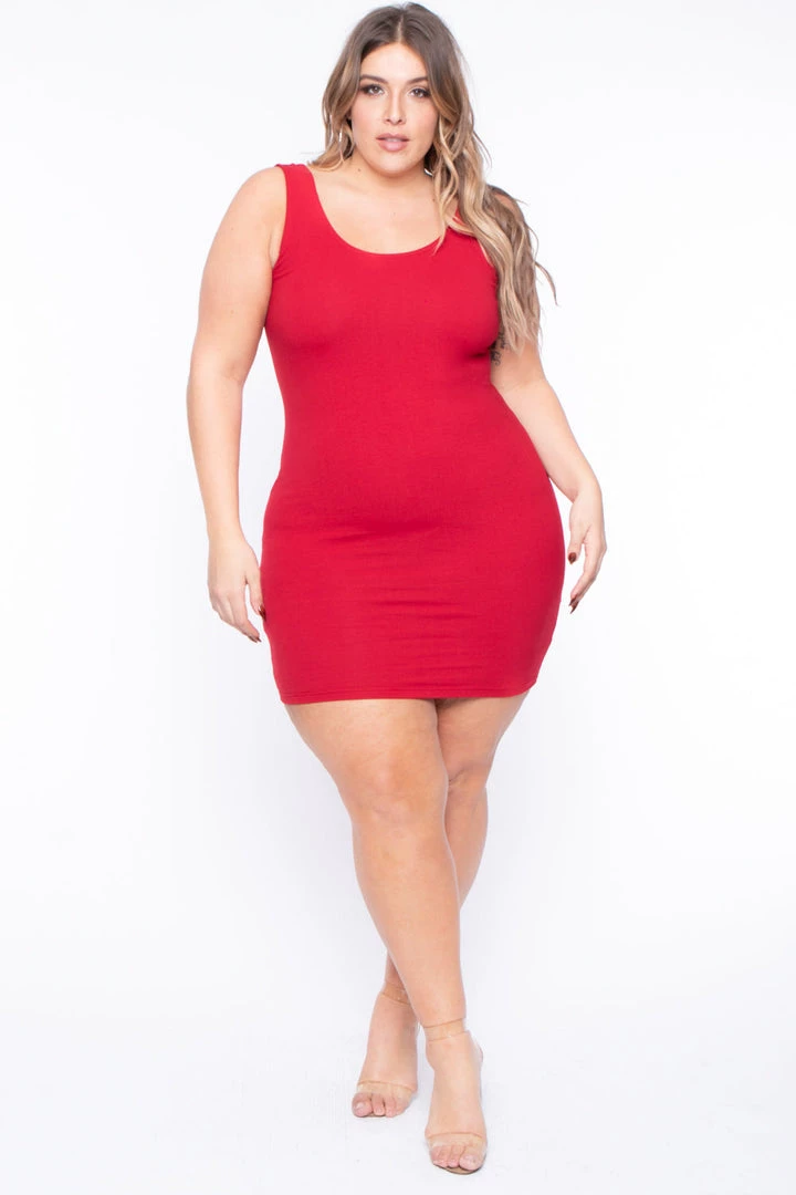 This plus size, extra stretch knit dress features a scoop neckline, a sleeveless cut with added contrast binding, and a bodycon silhouette. Great as a layering piece or can be worn by itself.