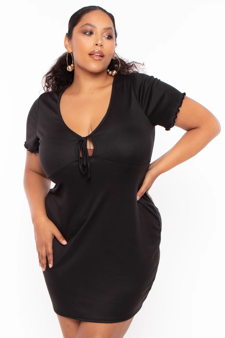 This plus size, stretch mini dress features a round neckline with front keyhole detail and self tie straps short sleeves with a merrowed hem detail, and a bodycon silhouette