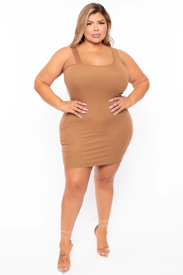 This plus-size, stretch knit ribbed dress features an asymmetric neckline, a sleeveless cut with and a bodycon silhouette.