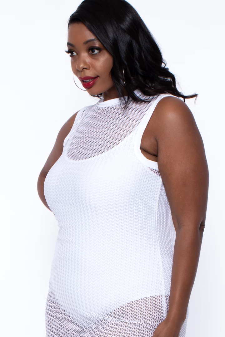 This plus size, novelty knit dress features a mock neckline with a keyhole and button closure, a sleeveless cut, contrast binding, transparent, mid length, and a bodycon silhouette.
