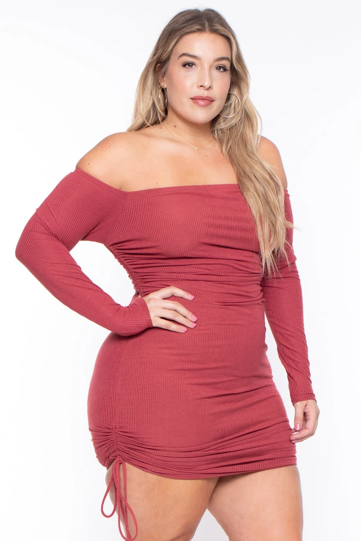 This plus size, off the shoulder dress features your curves in this amazing bodycon silhouette and side ruched detailing, off the shoulder with long sleeves, so easy to dress up or down!