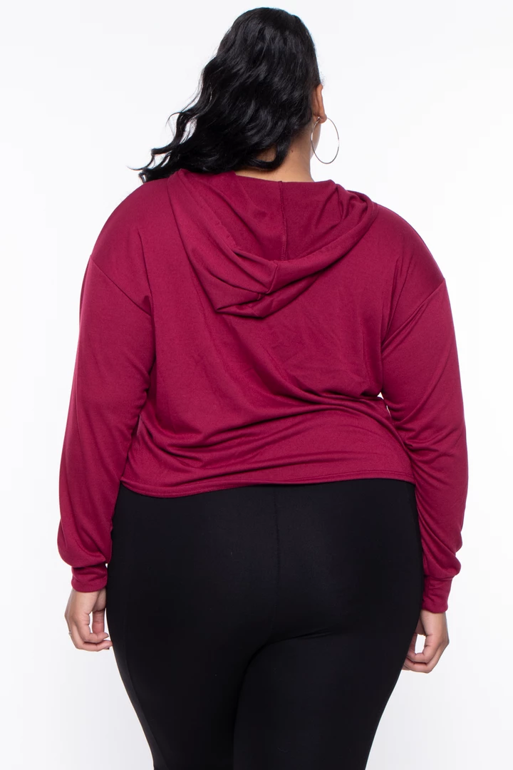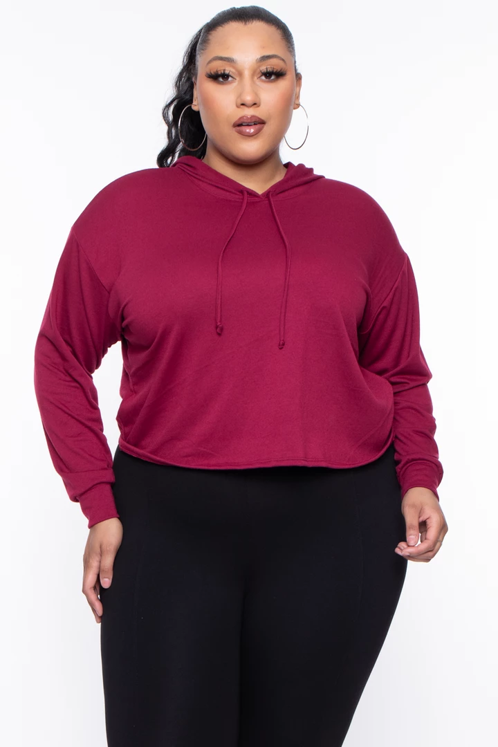 This plus size, stretch knit hoodie features a drawstring hoodie, long sleeves with self cuff banded, dropped shoulders, and a cropped hem with self banded hem