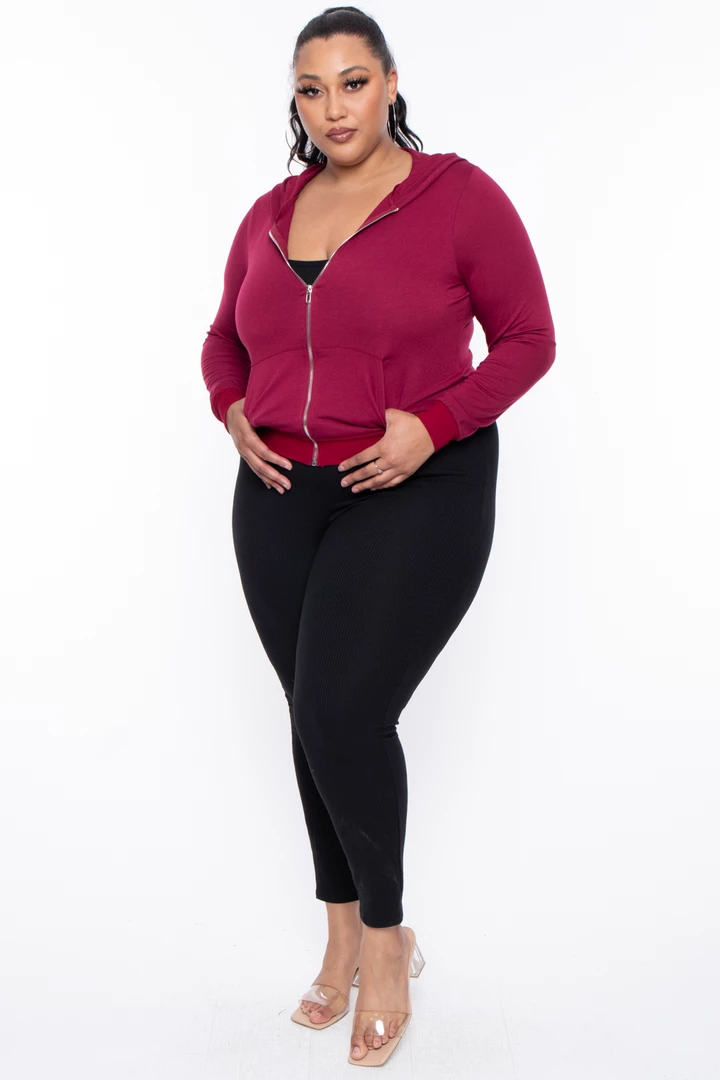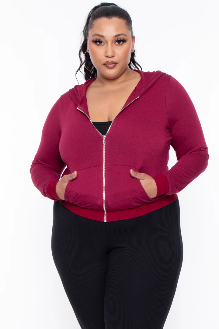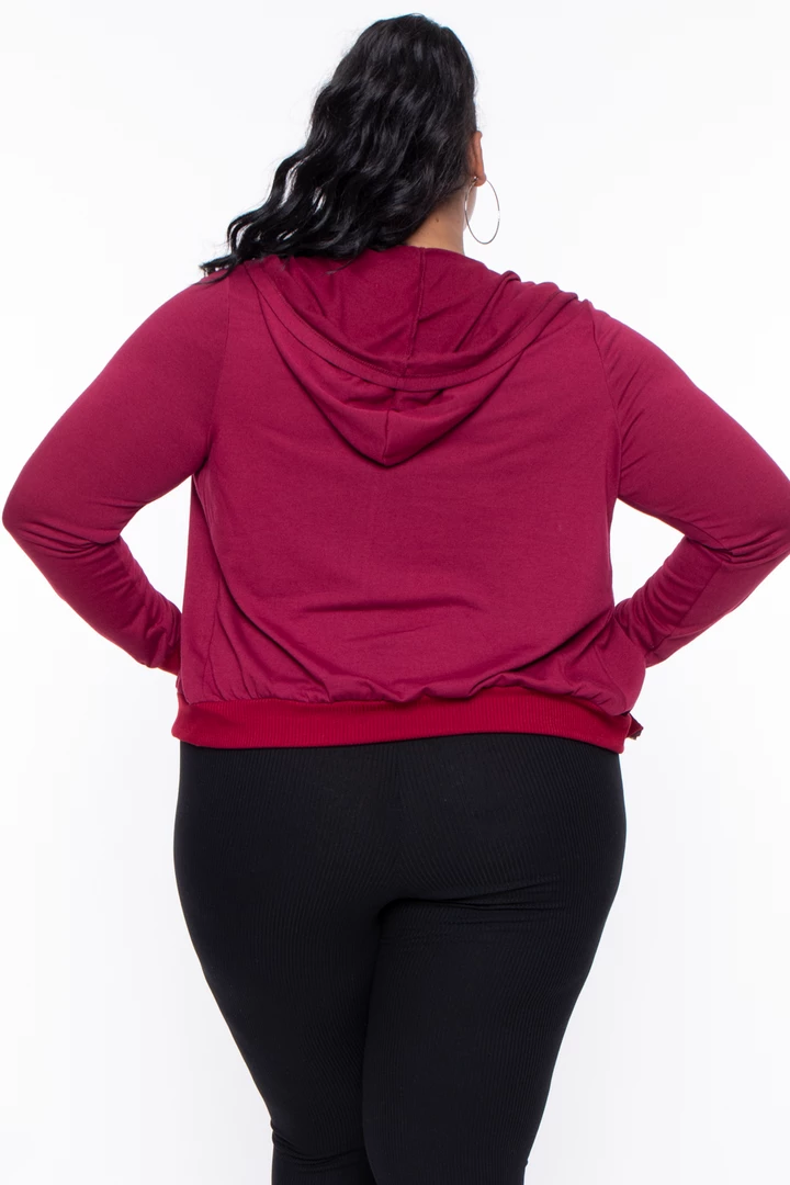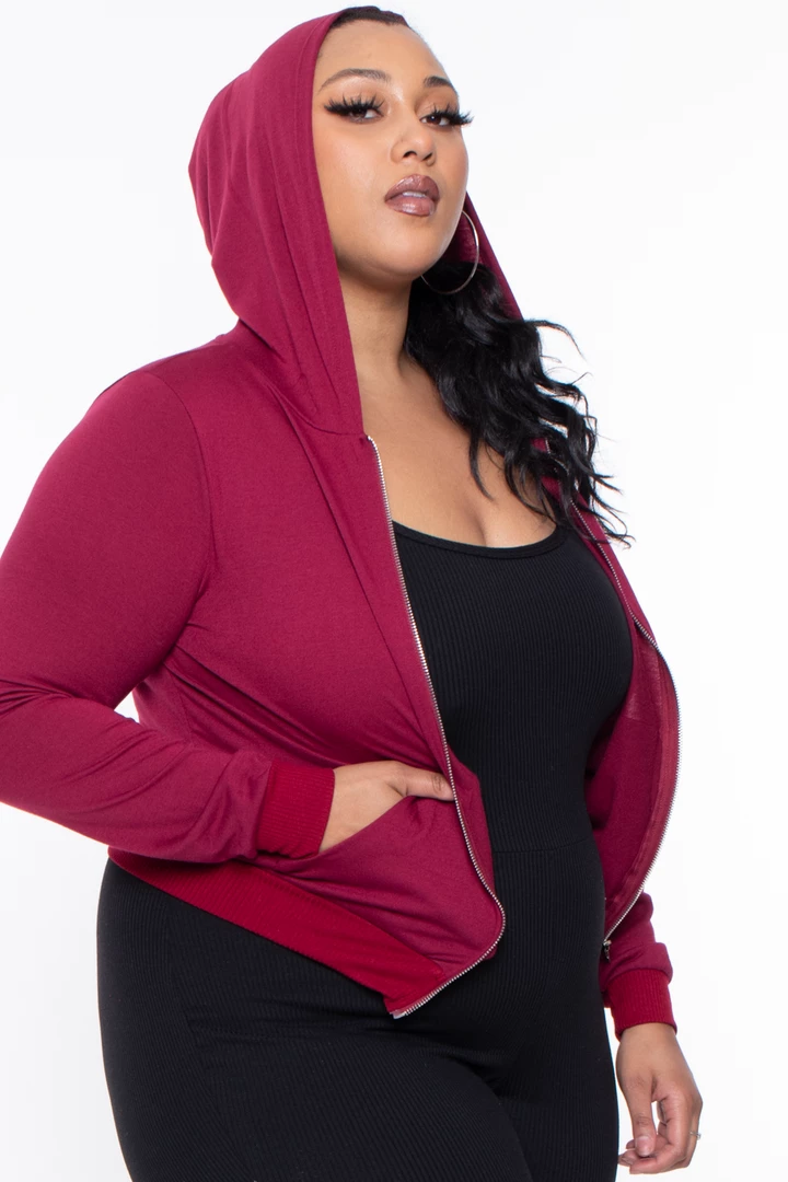 This plus size, stretch knit zip-up hoodie features a front zipper closure a hoodie, long sleeves with contrast ribbed banded, dropped shoulders, and a cropped hem with ribbed contrast band