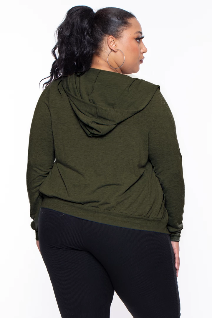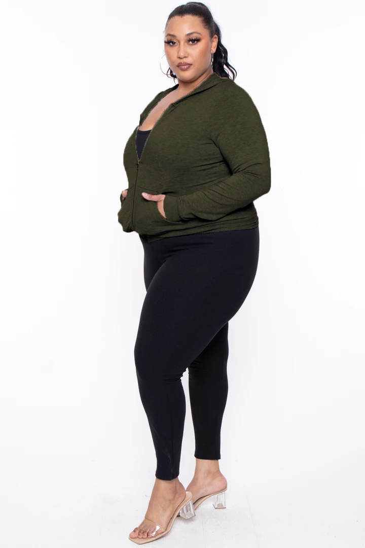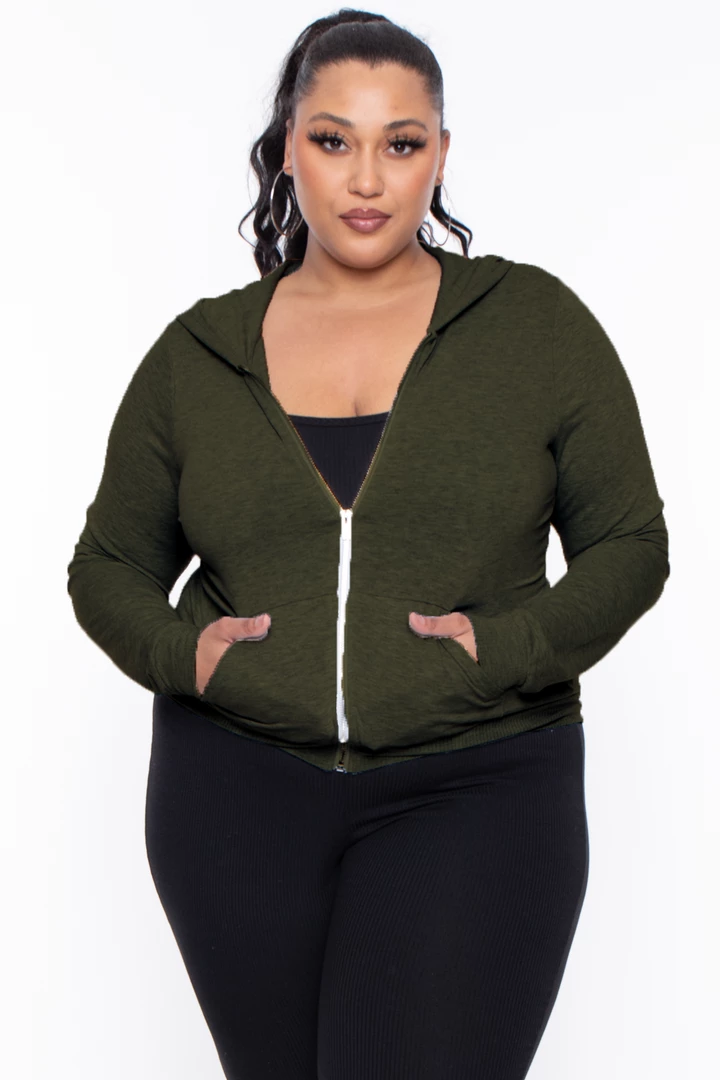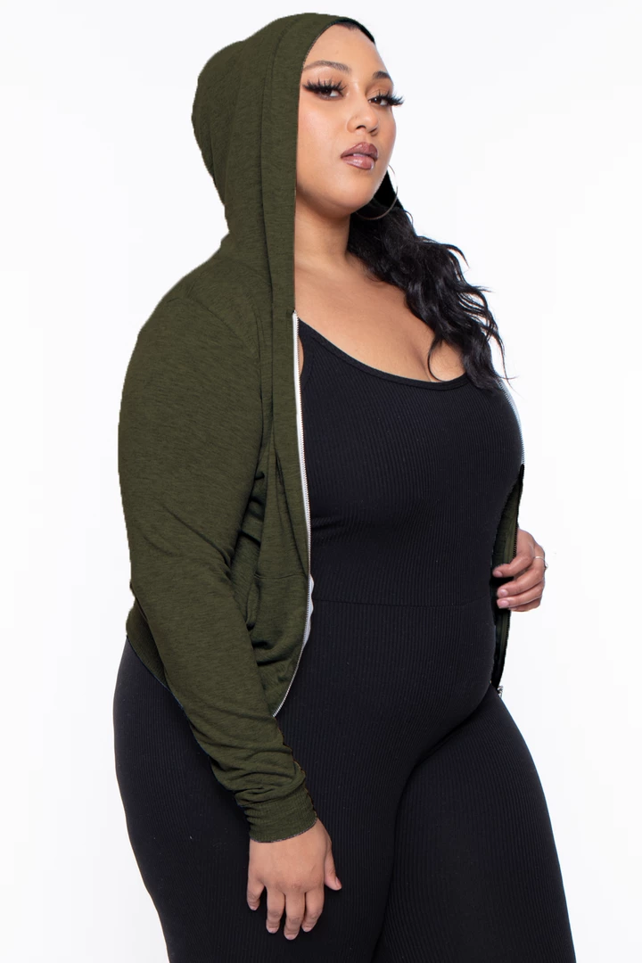 This plus size, stretch knit zip-up hoodie features a front zipper closure a hoodie, long sleeves with contrast ribbed banded, dropped shoulders, and a cropped hem with ribbed contrast band