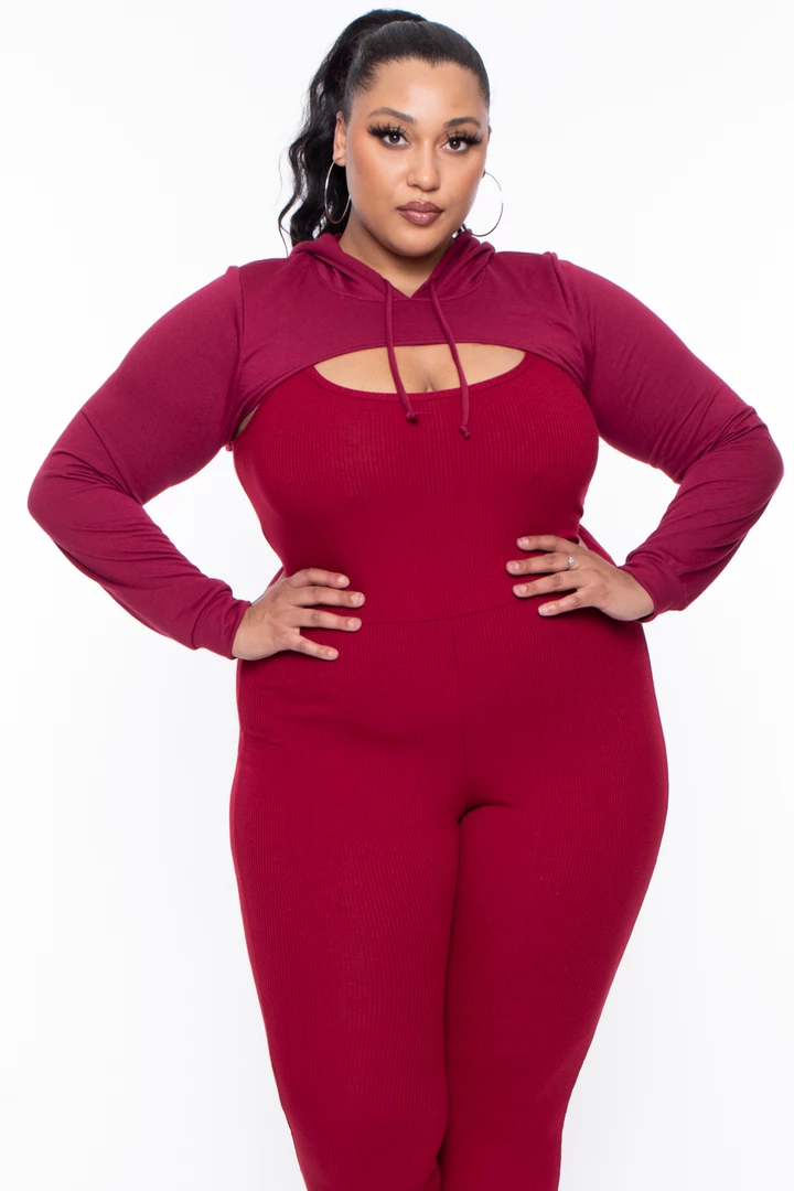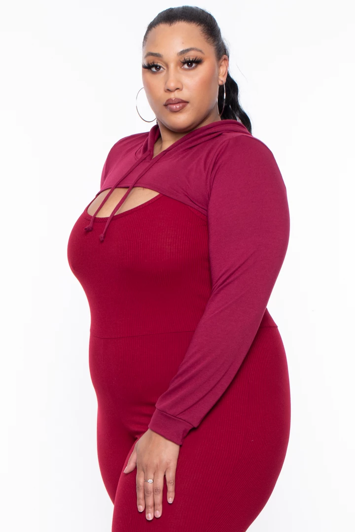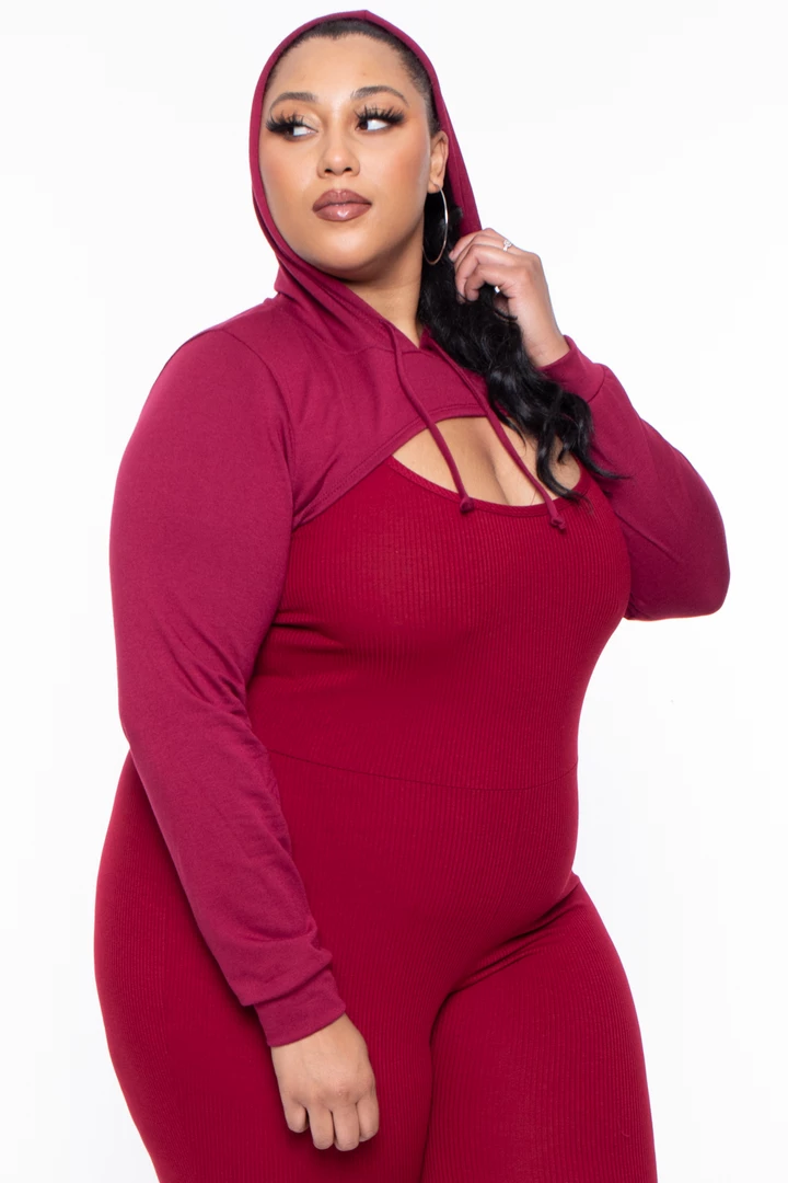 This plus size, stretch knit hoodie features a drawstring hoodie, front and back cut out detail long sleeves with self cuff banded, dropped shoulders, and a cut out cropped hem