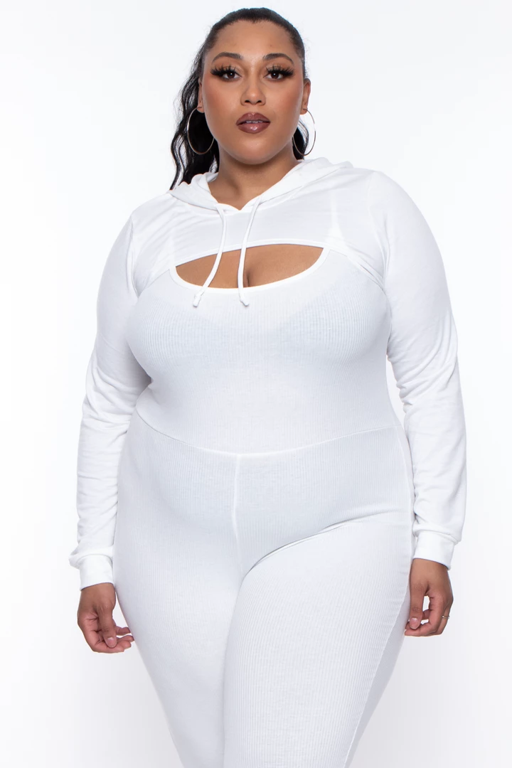 This plus size, stretch knit hoodie features a drawstring hoodie, front and back cut out detail long sleeves with self cuff banded, dropped shoulders, and a cut out cropped hem