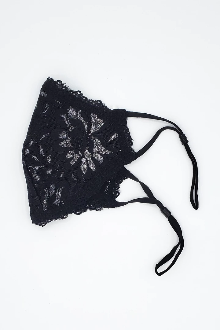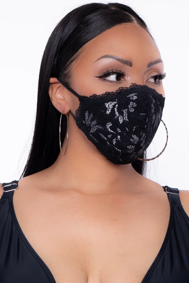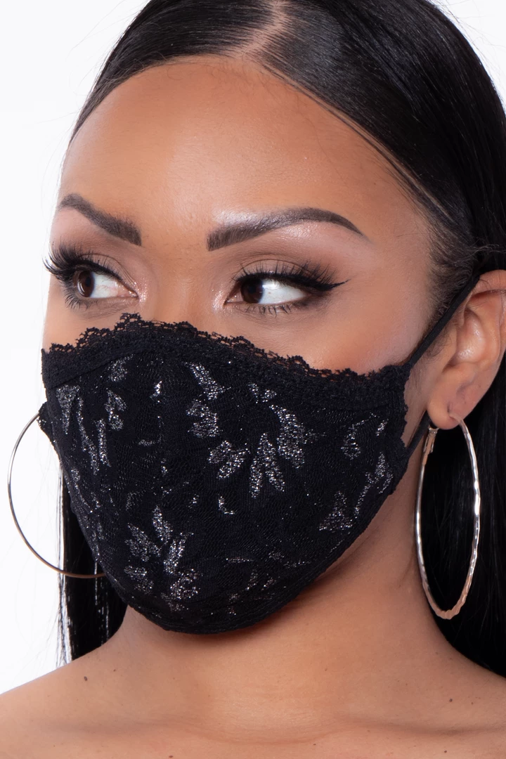 This washable and reusable unisex mask is made of a metallic lace outer layer and dual-layer soft cotton-spandex jersey material that makes it comfortable and breathable. The stretch bands make them stretch so that they fit faces of all sizes. Embroidery on the left side of the mask.