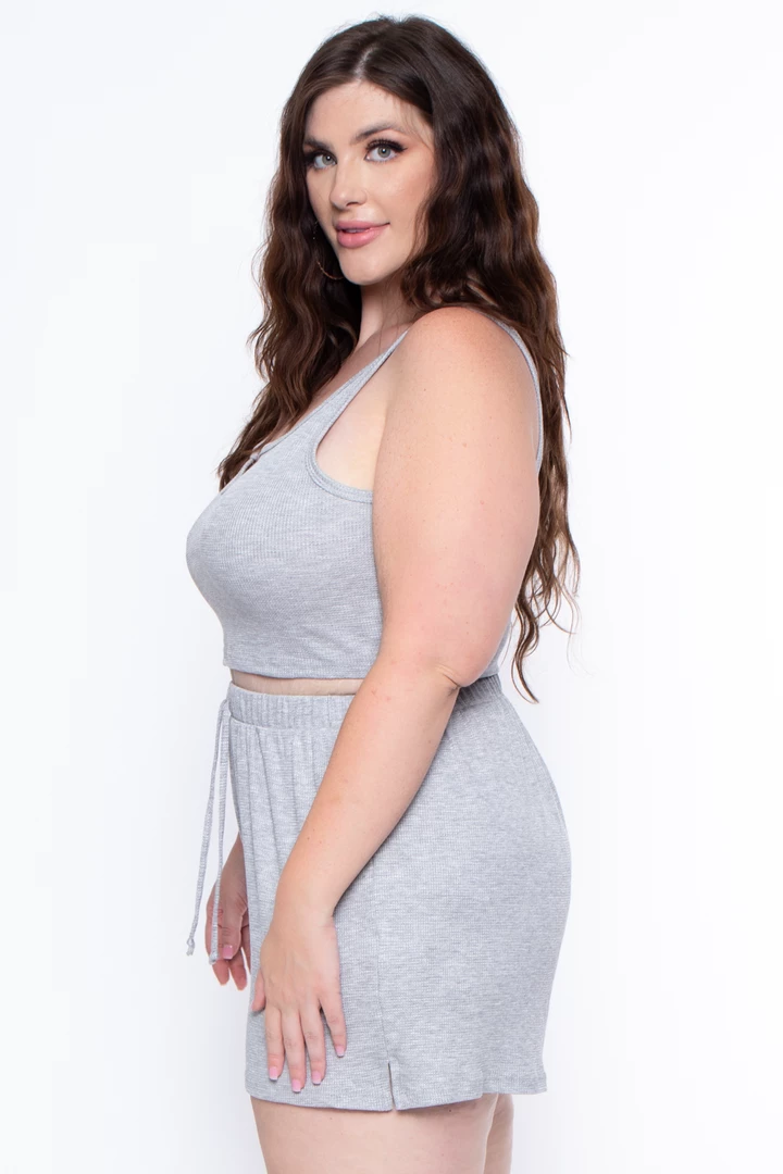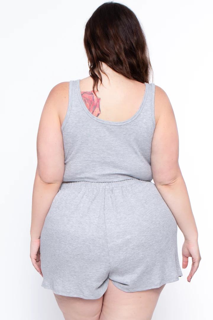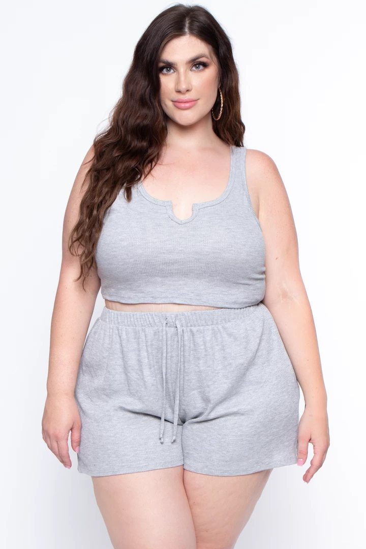 This plus size waffle thermal knit set features a crop tank top with a V slit detail. The softest shorts features an elastic waist, flowy leg opening with a self tie detail.