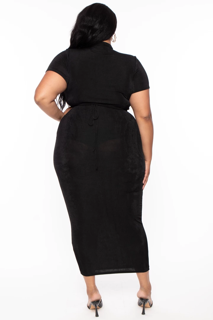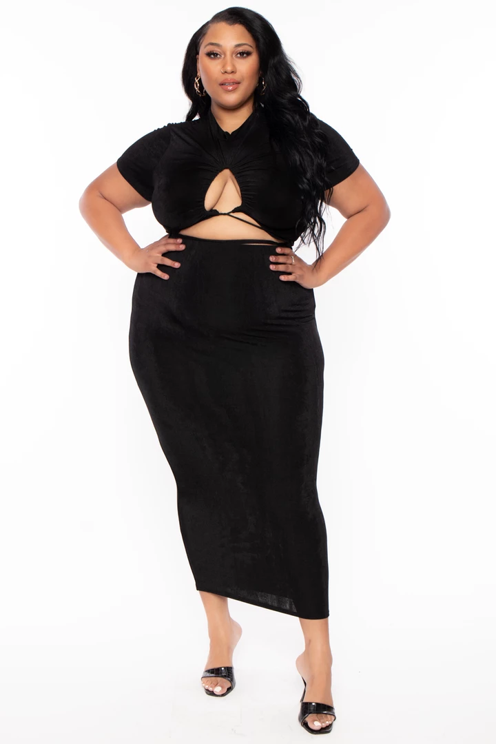 This plus size stretch knit two-piece set features an all over slinky fabric, a top with a mock neckline, short sleeves, a center adjustable drawstring tie front that forms a keyhole, and a cropped hem. Paired with a matching over the belly skirt with an elasticized waist and a form fitting maxi length silhouette.
