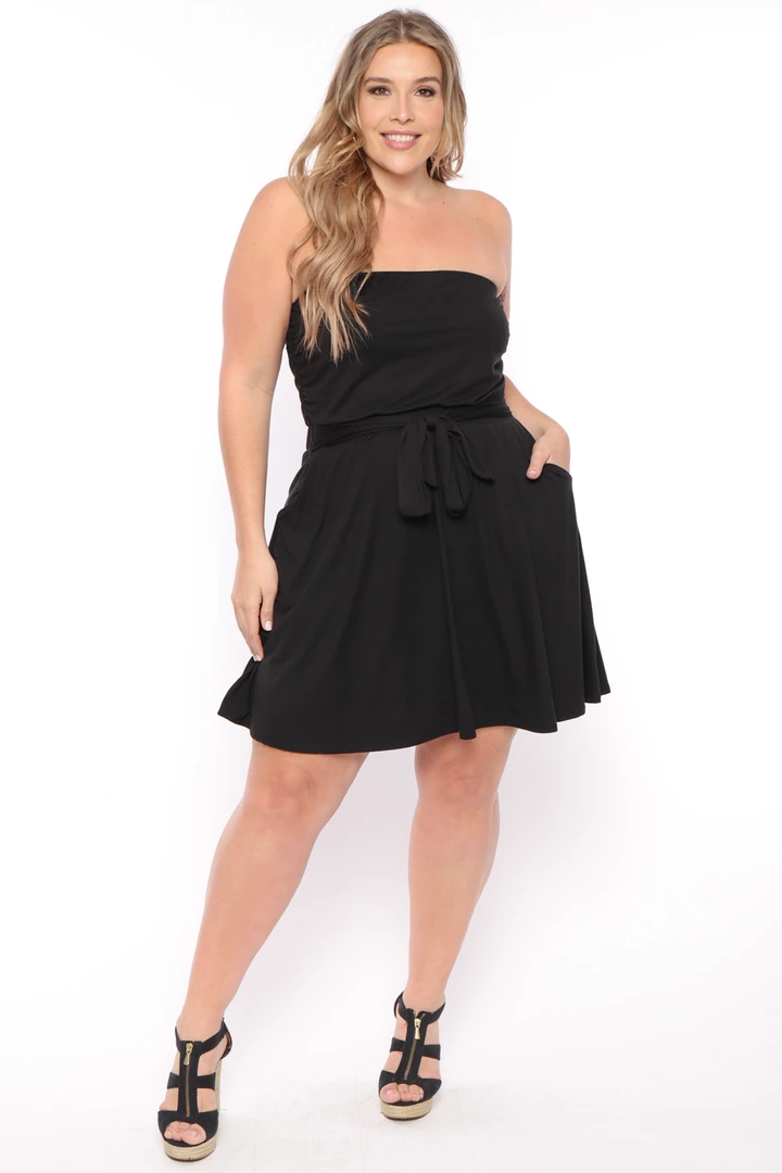 This plus size, stretch knit dress features a strapless neckline with elastic for better support an elastic waist and self-belted, front side pockets, and a flowy silhouette.