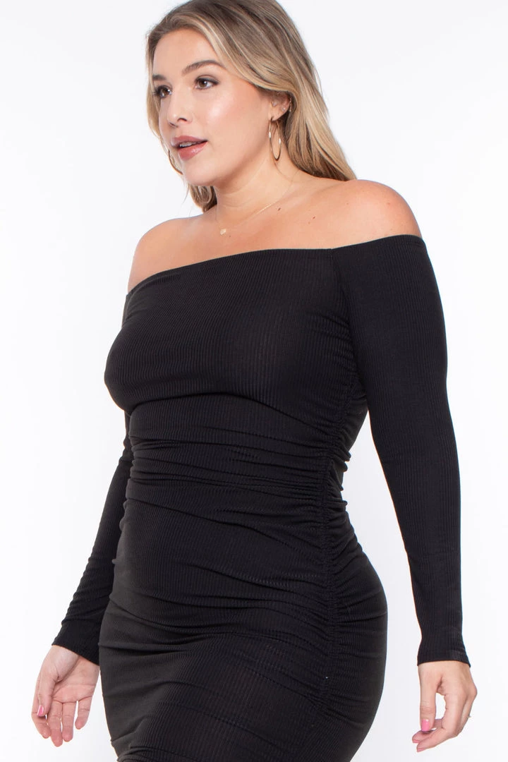 This plus size, off the shoulder dress features your curves in this amazing bodycon silhouette and side ruched detailing, off the shoulder with long sleeves, so easy to dress up or down!