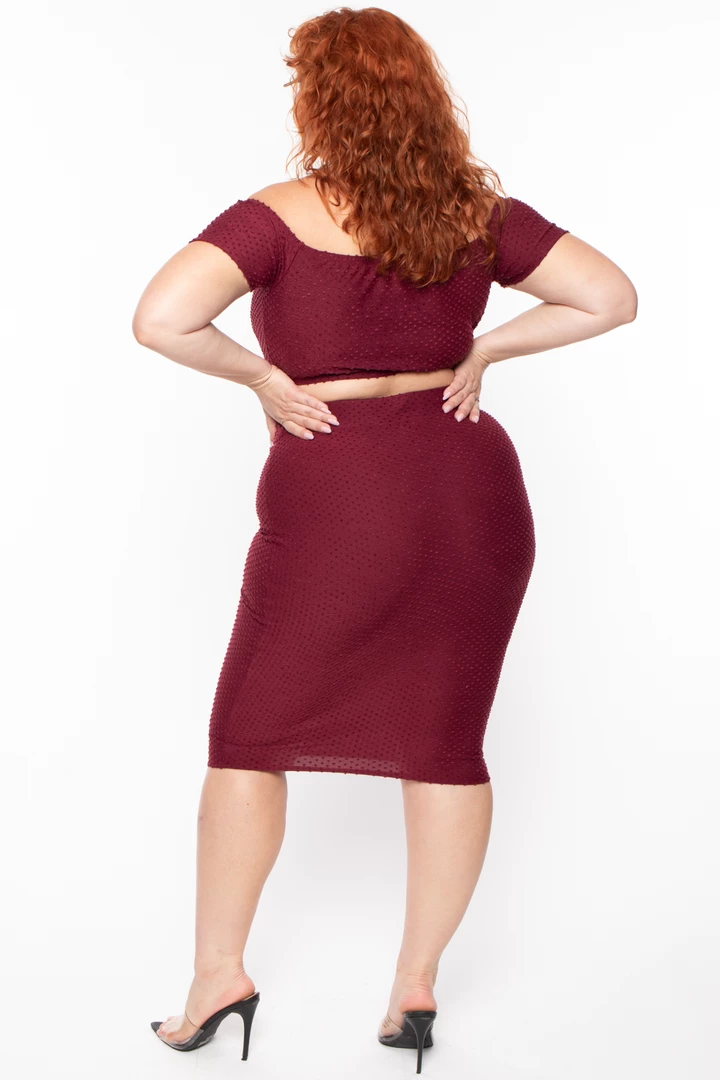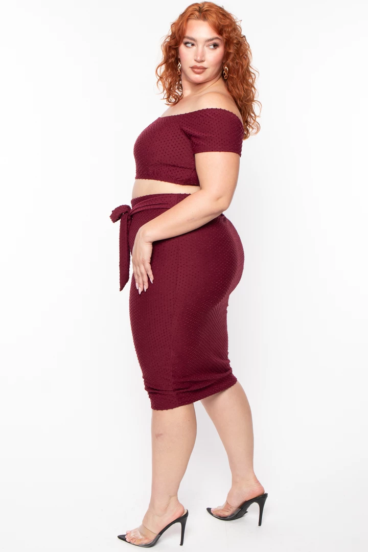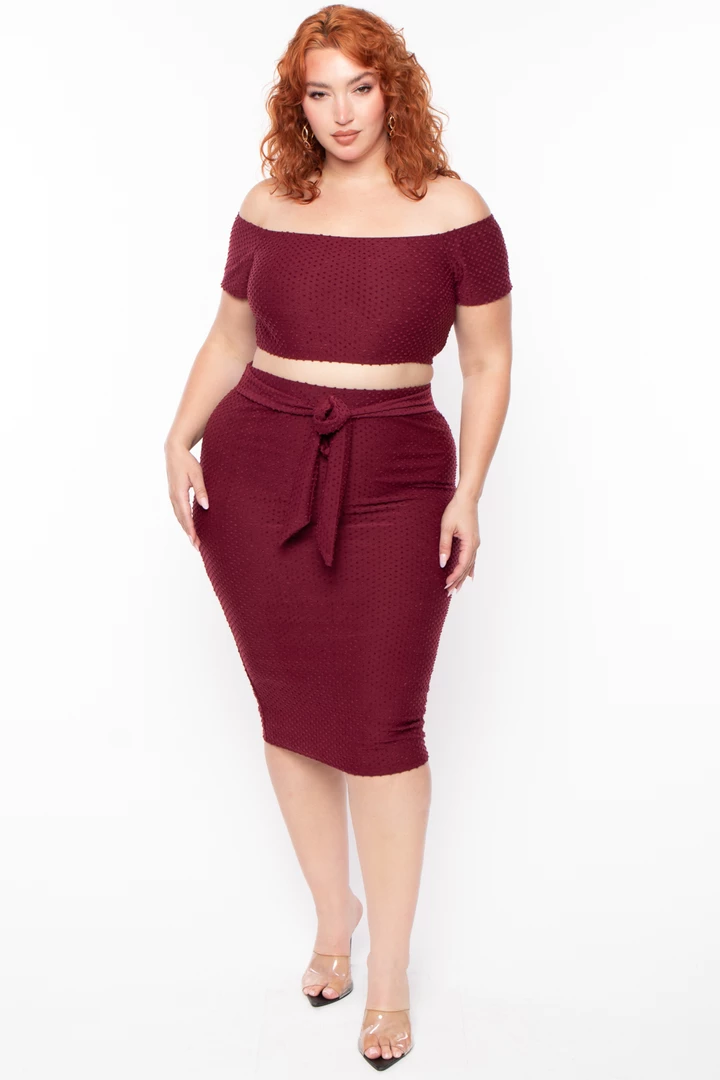 This plus size, stretch knit ribbed two-piece set features an all over textured design, a crop top with an off the shoulder neckline, short sleeves, a matching skirt with an elastic waist and a sash tie belt detail, and form fitting silhouetteÂ