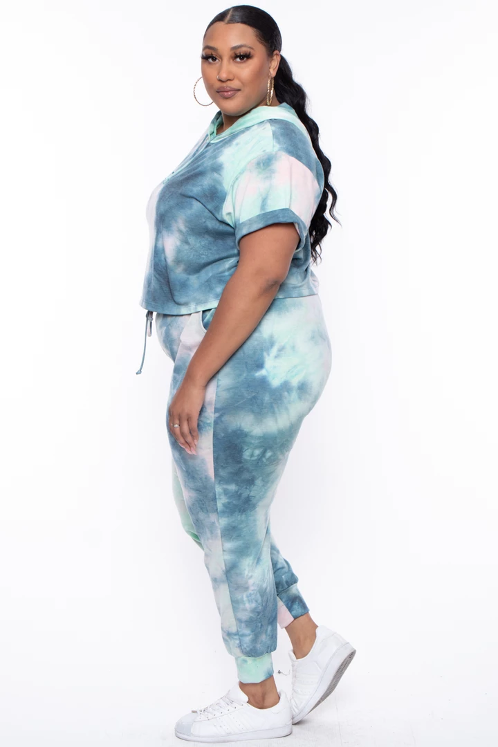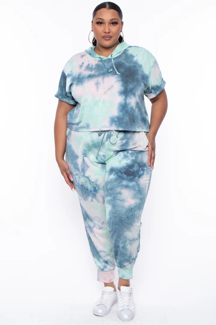 This plus size, super-soft French terry set features an all-over tie-dye print, a drawstring hood, short sleeves, and a cropped hem. The joggers feature an elastic waist, front self-tie drawstring, side pockets & banded bottom at ankles.