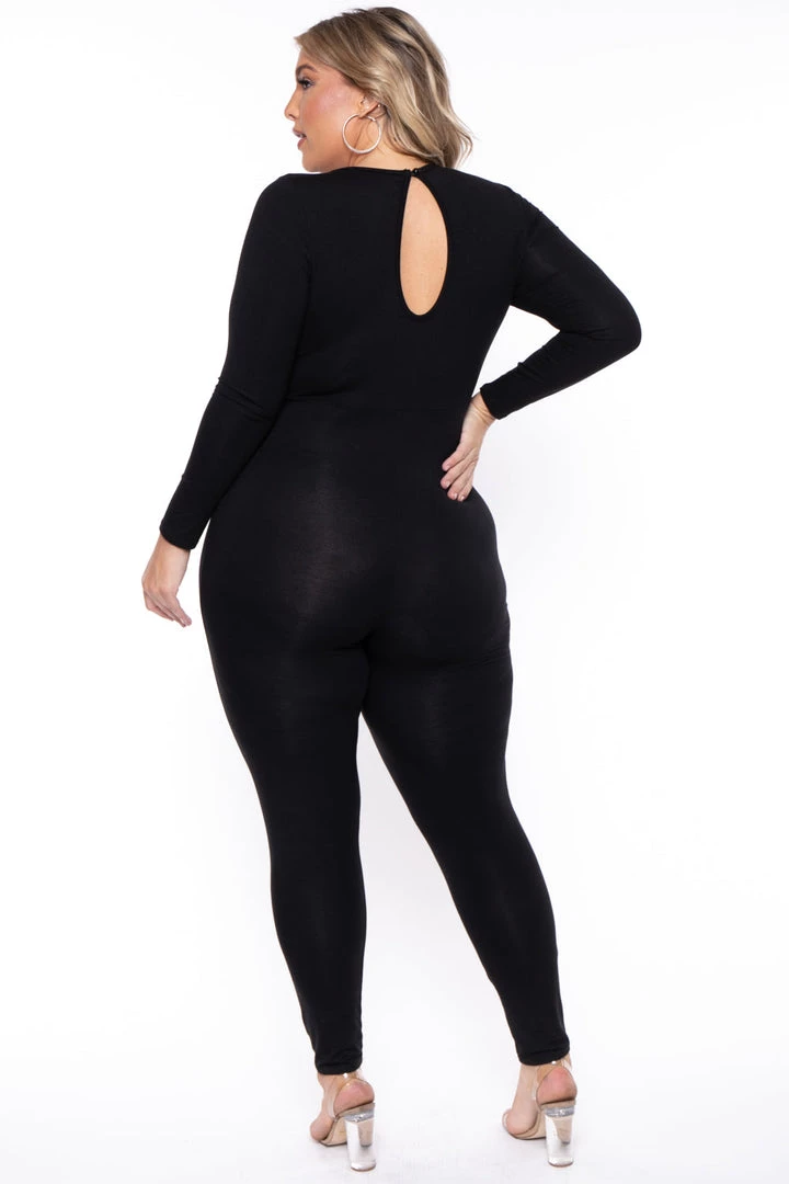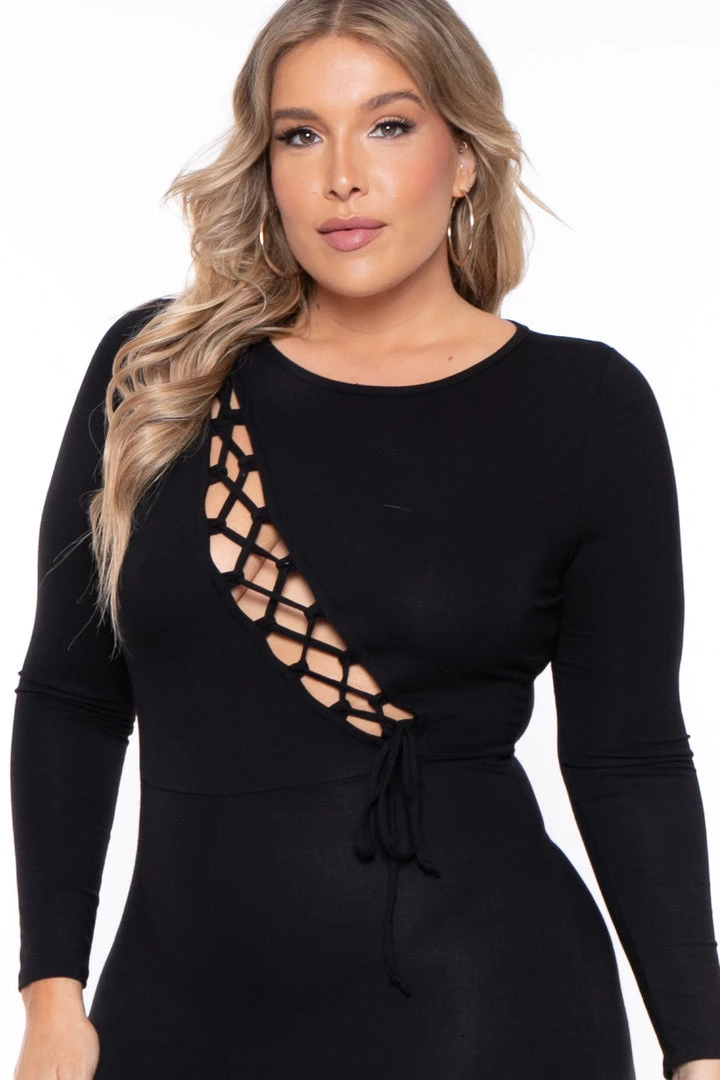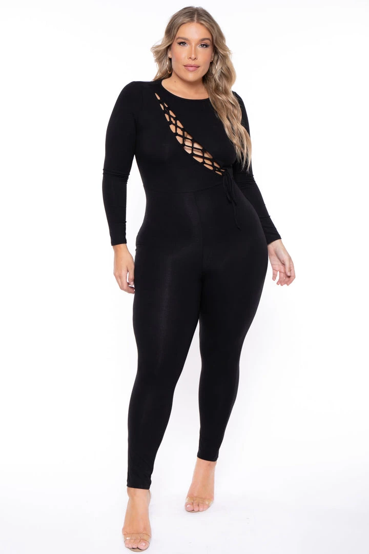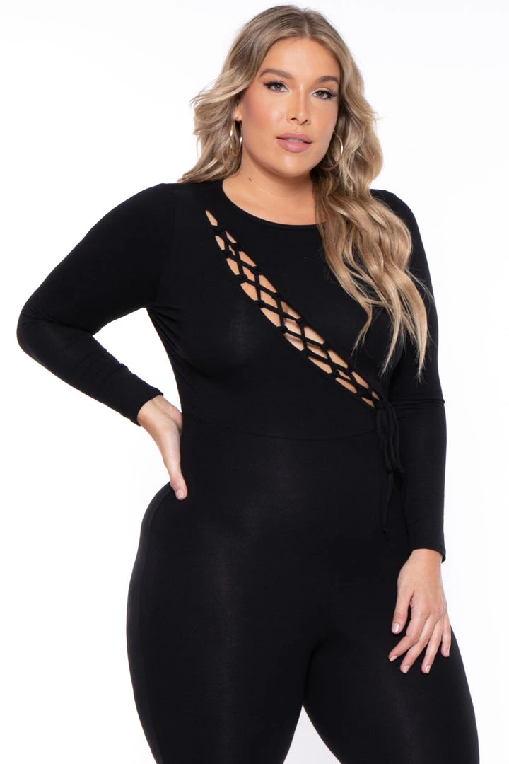 This plus size, jumpsuit features a sexy lace-up detail across the front, long sleeves and flattering silhouette, back keyhole cut out with dome button closure