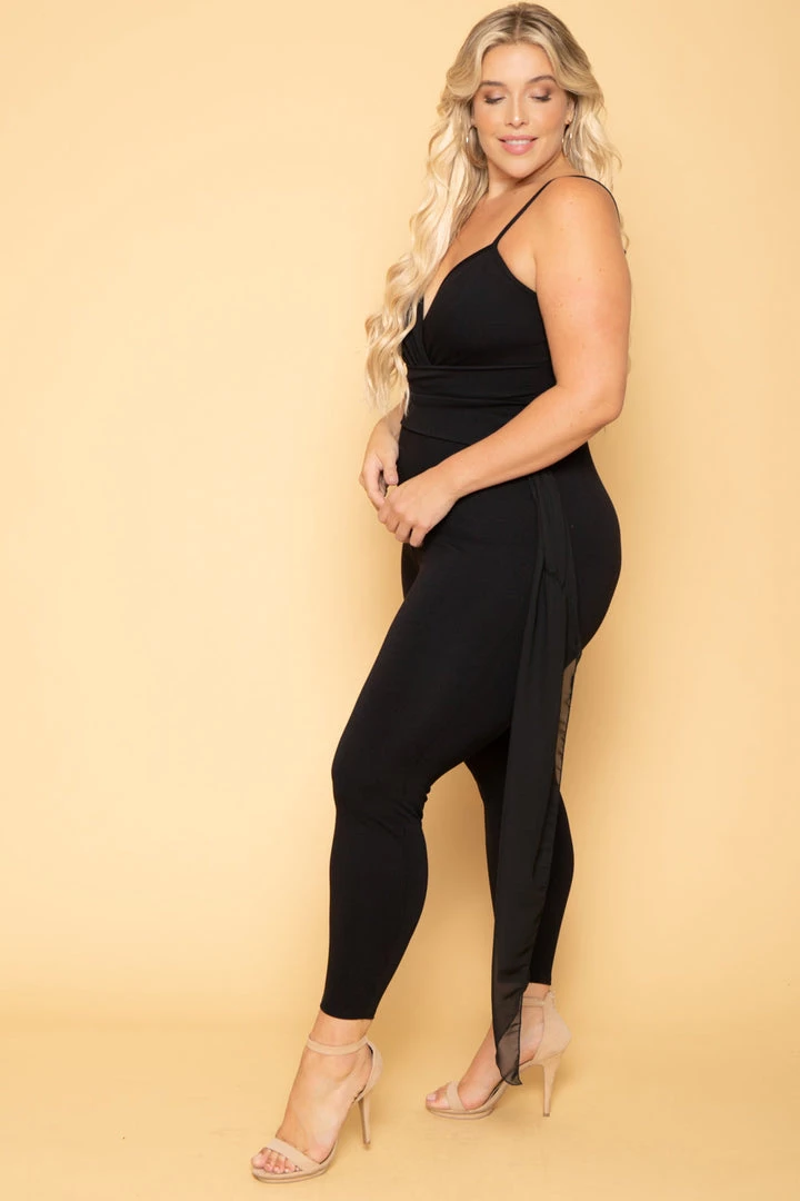 This plus size stretch jumpsuit features a surplice v-neckline, adjustable cami straps, sleeveless, an attached belted waist, side chiffon sash, and long slim legs.Â
