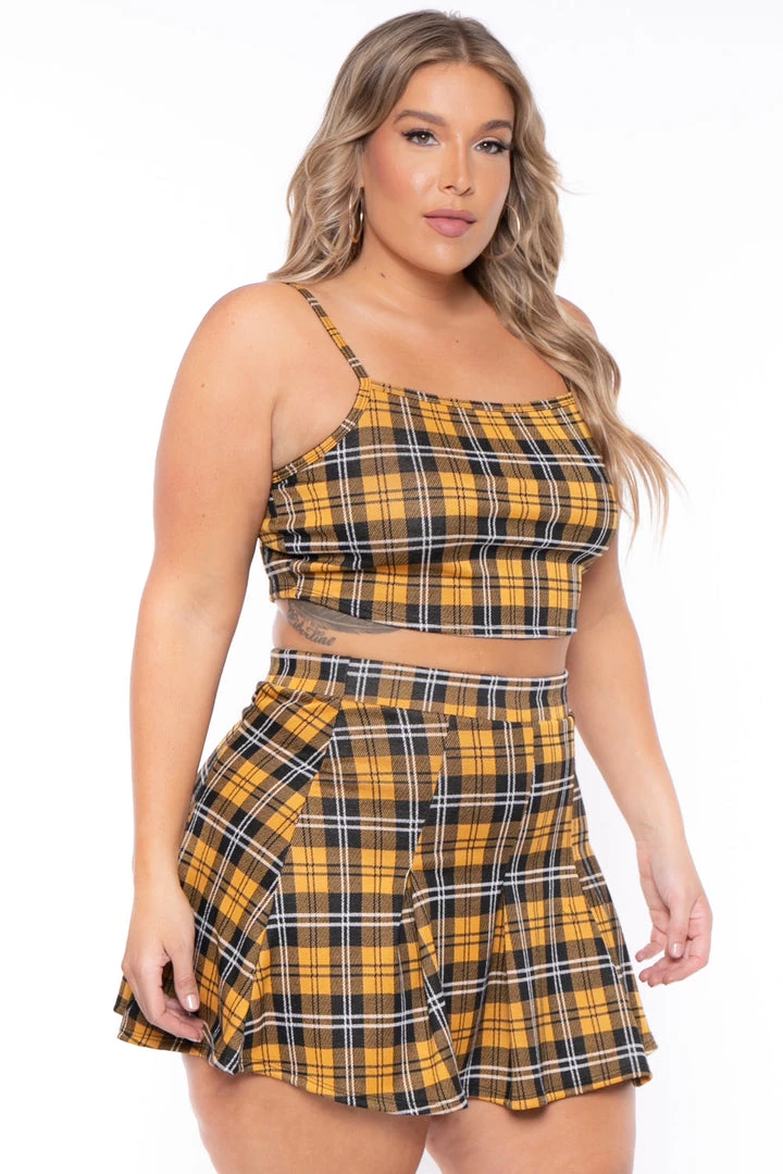 This plus size, matching skirt set features an adorable plaid design with a mini skirt and crop top, has adjustable straps. Perfect for a fun and flirty look!