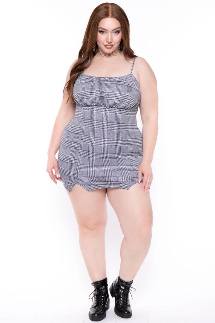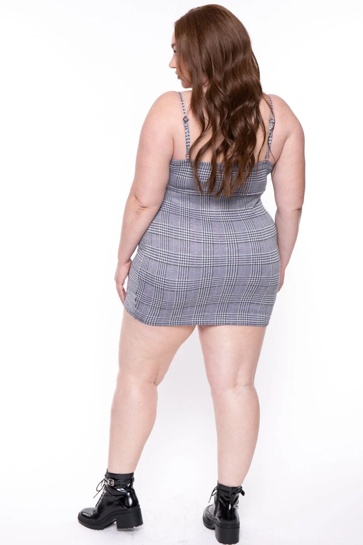This plus size, bodycon dress features an all over plaid design, sleeveless with adjustable straps and amazing stretch!