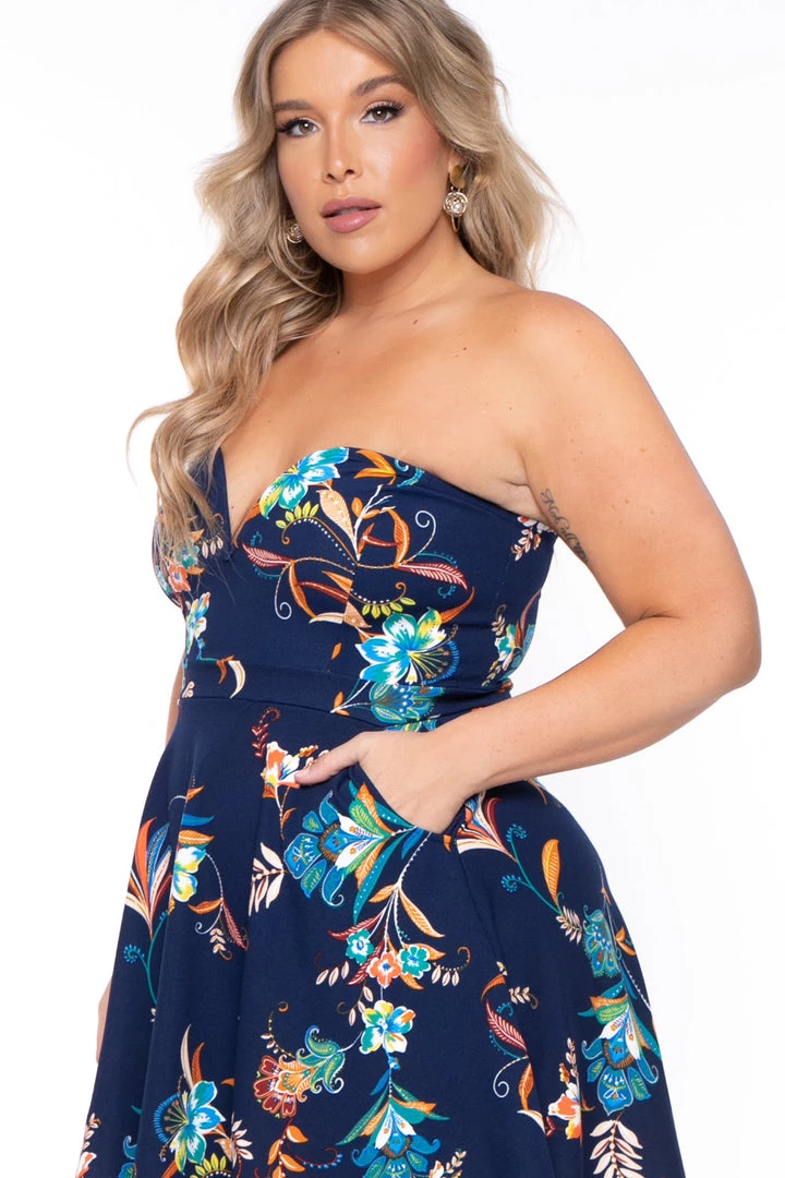 This plus size, stretch knit crepe dress features an all over floral design, sweetheart neckline, V-Wire detail, this A-line flare silhouette, and this dress has pockets.