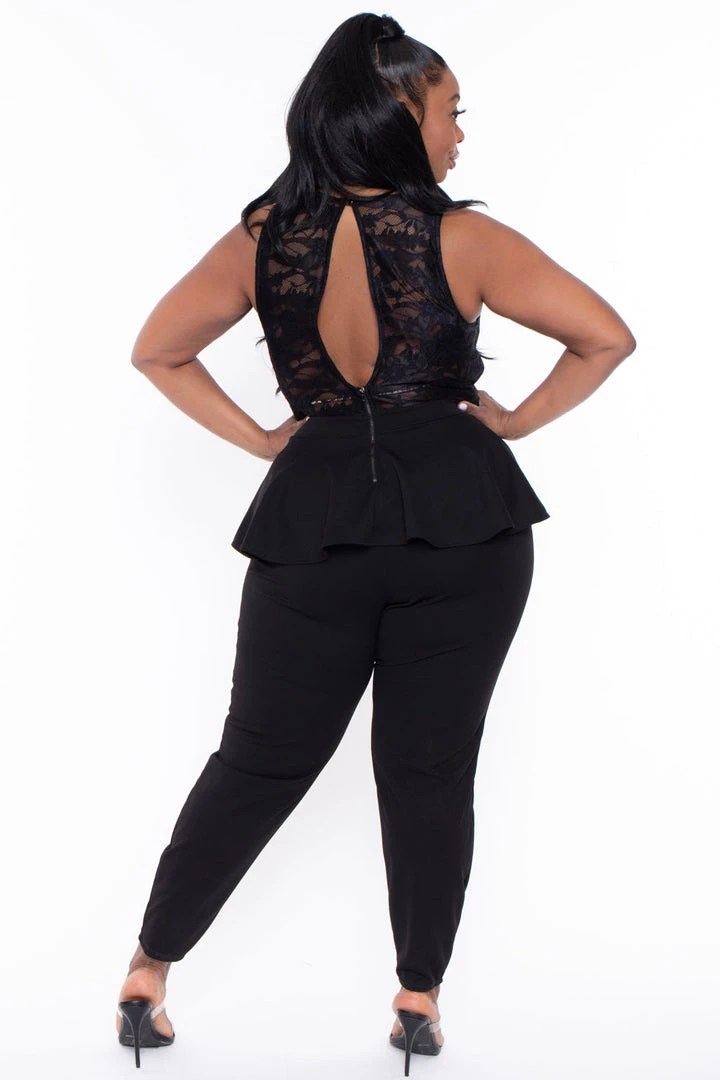 This plus size, stretch knit jumpsuit features a round neckline with a contrast lace top back keyhole with button closure, a sweetheart cut with princess seams, a self waistband, peplum detail at waist, and a skinny leg. There is a center back zipper closure.