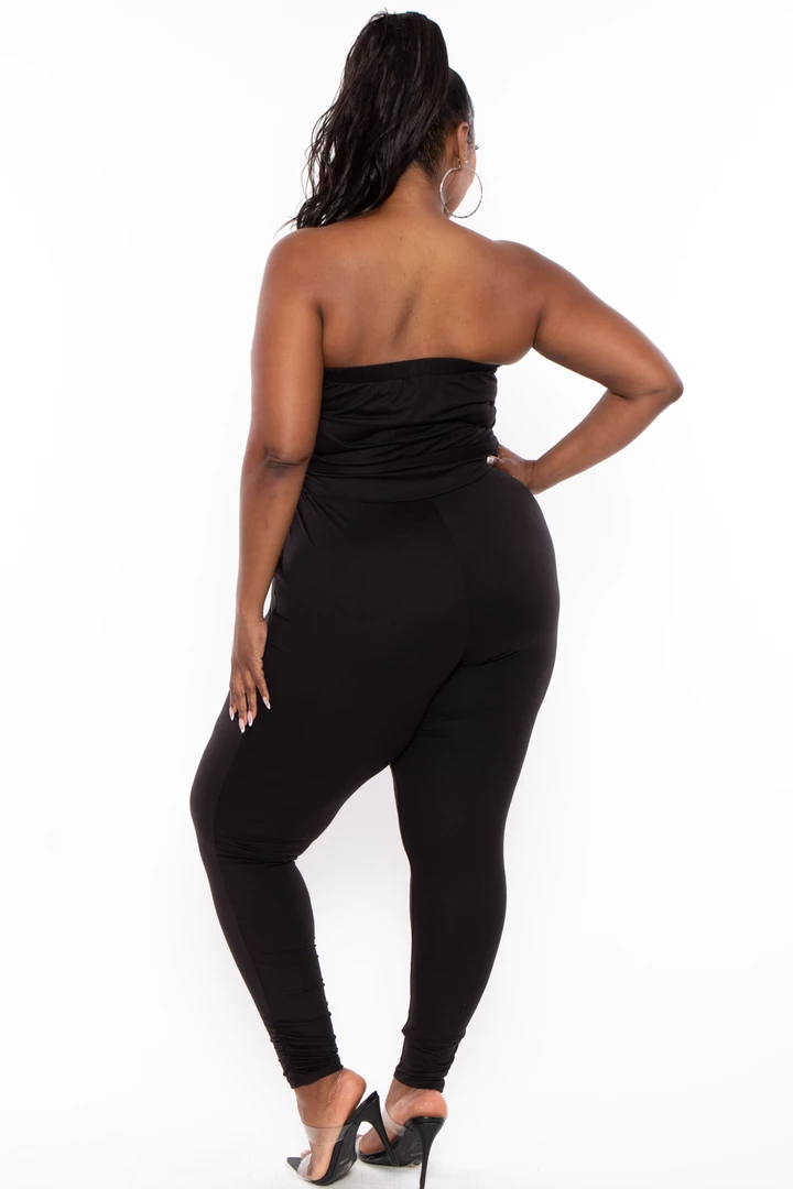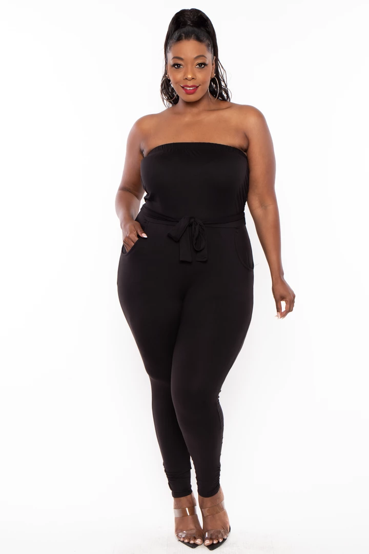 This plus size, stretch knit jumpsuit features a strapless neckline, elastic waist, front pockets, a self-tie belt, and a ruched detailing at bottom hemline. Super comfy & perfect to dress up or down.