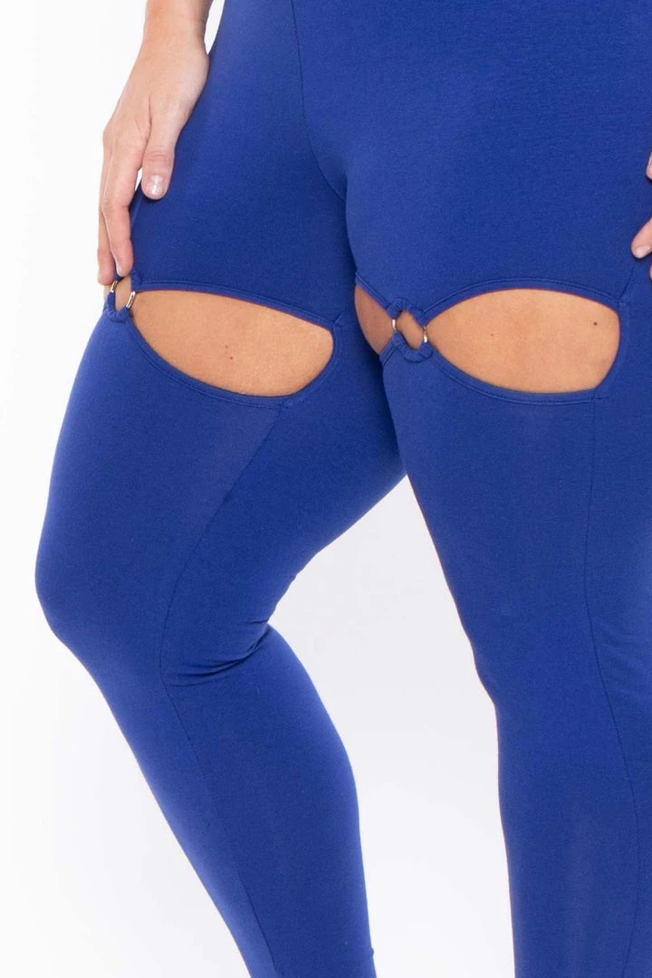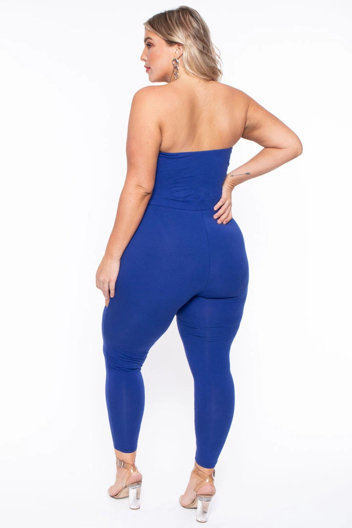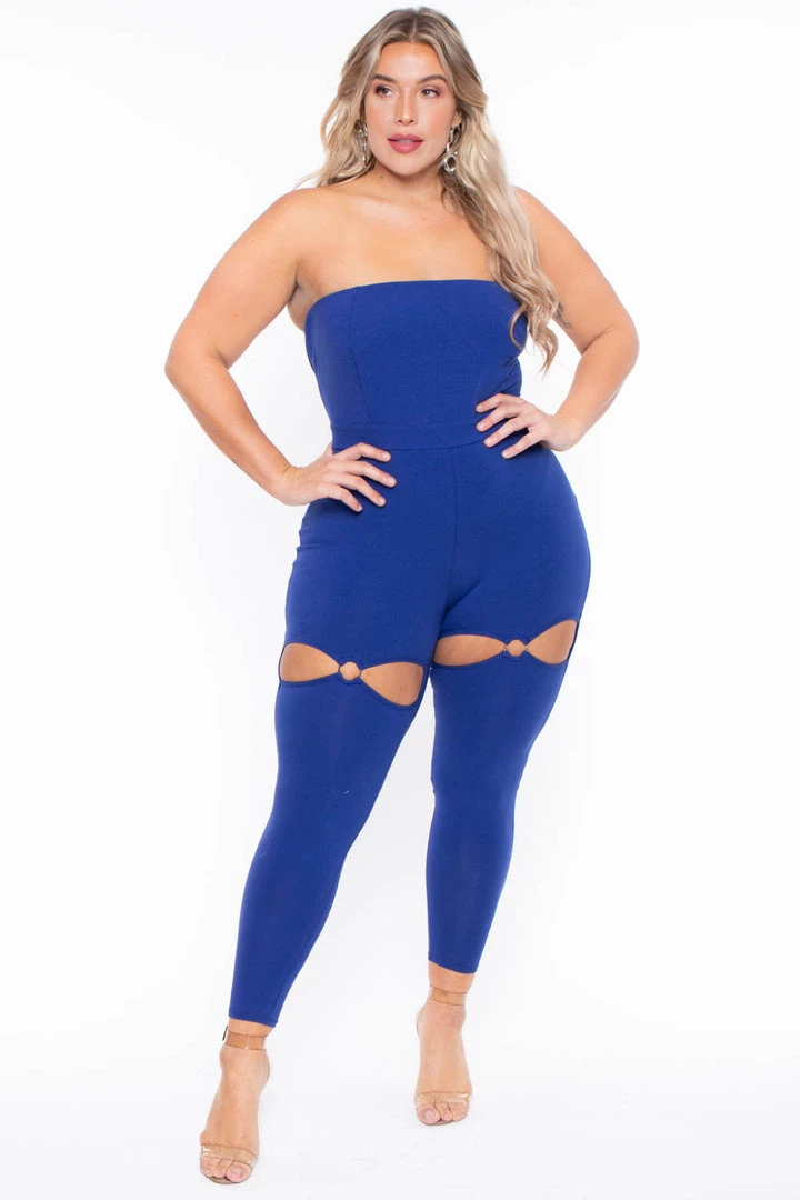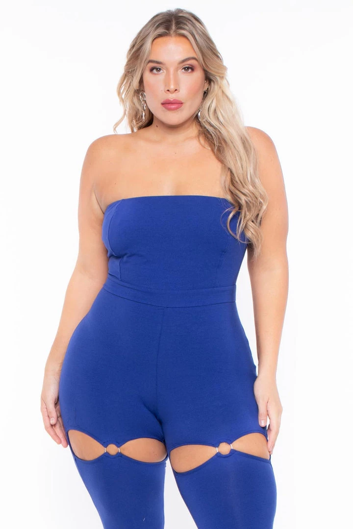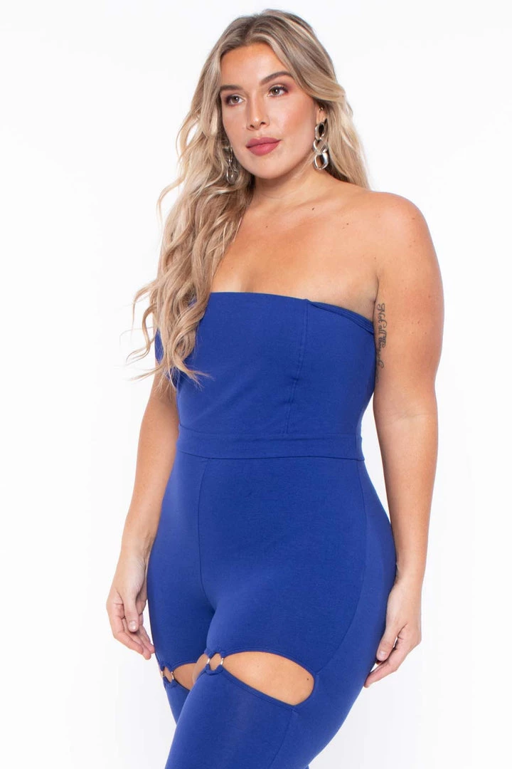 This plus size, jumpsuit is perfect for dancing all night! Alessa features a strapless, curvy-hugging silhouette, and sexy cut outs with silver ring detail