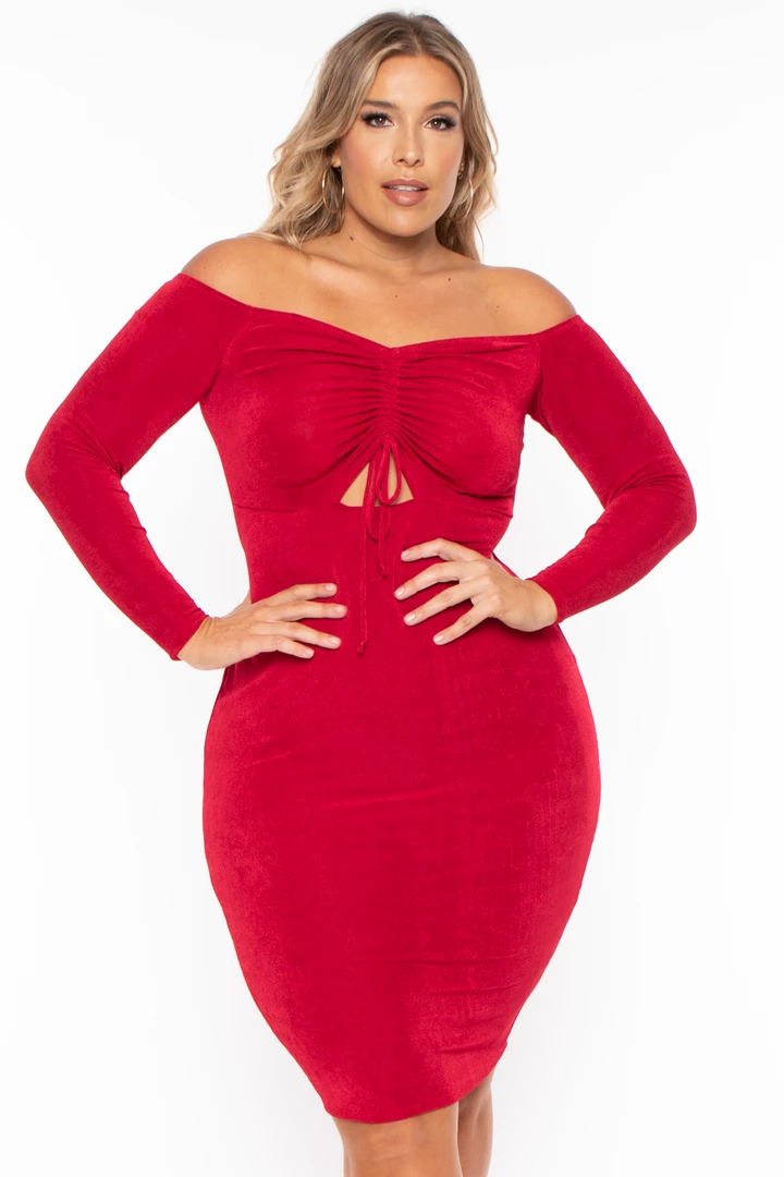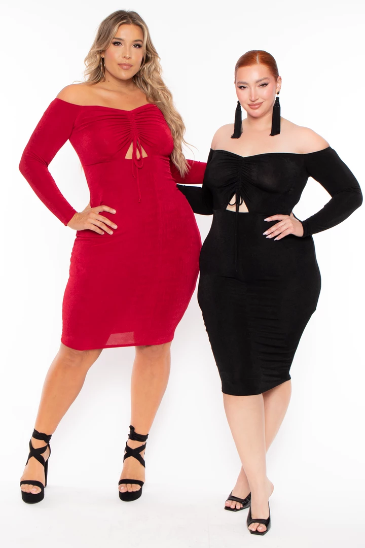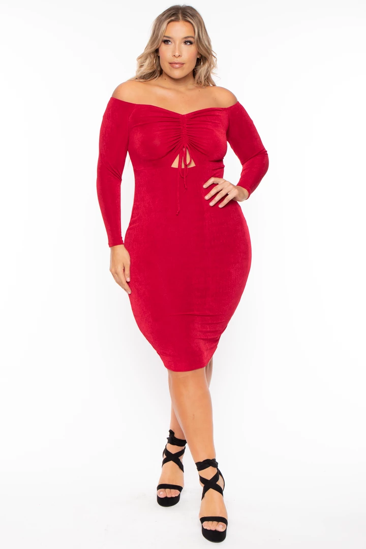 This plus size, long sleeve off the shoulder features ruching details and front cut out with drawstring.