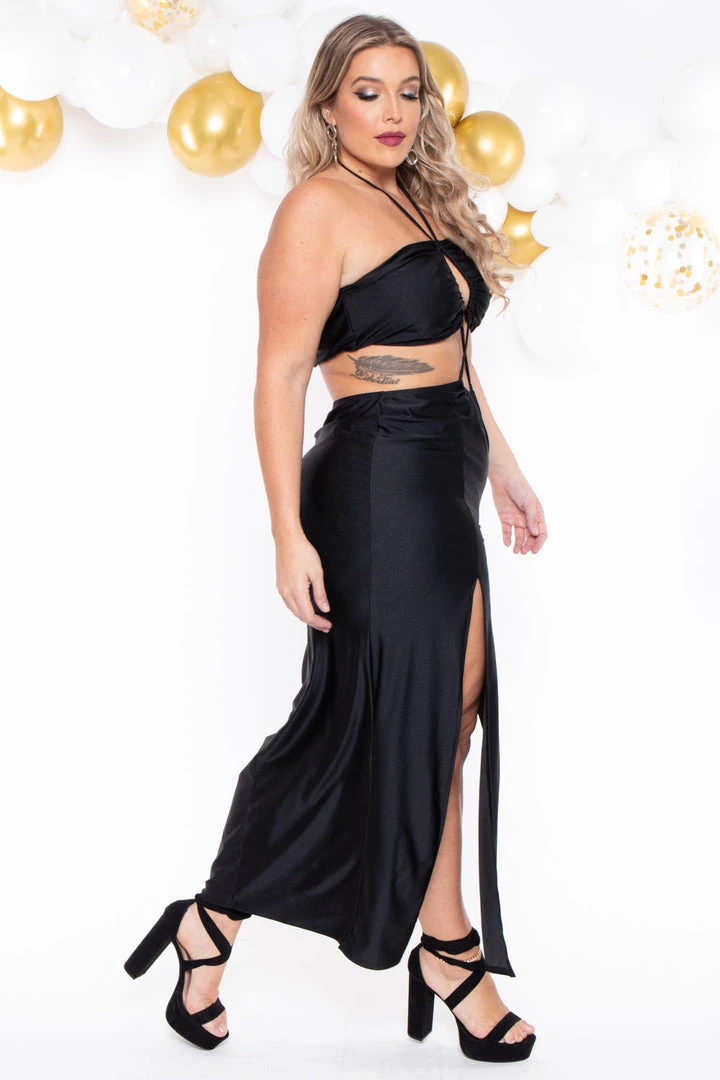 This plus size, dress features curvy-hugging silhouette. Layana features a sexy cutout style with stap accents and double front slits.