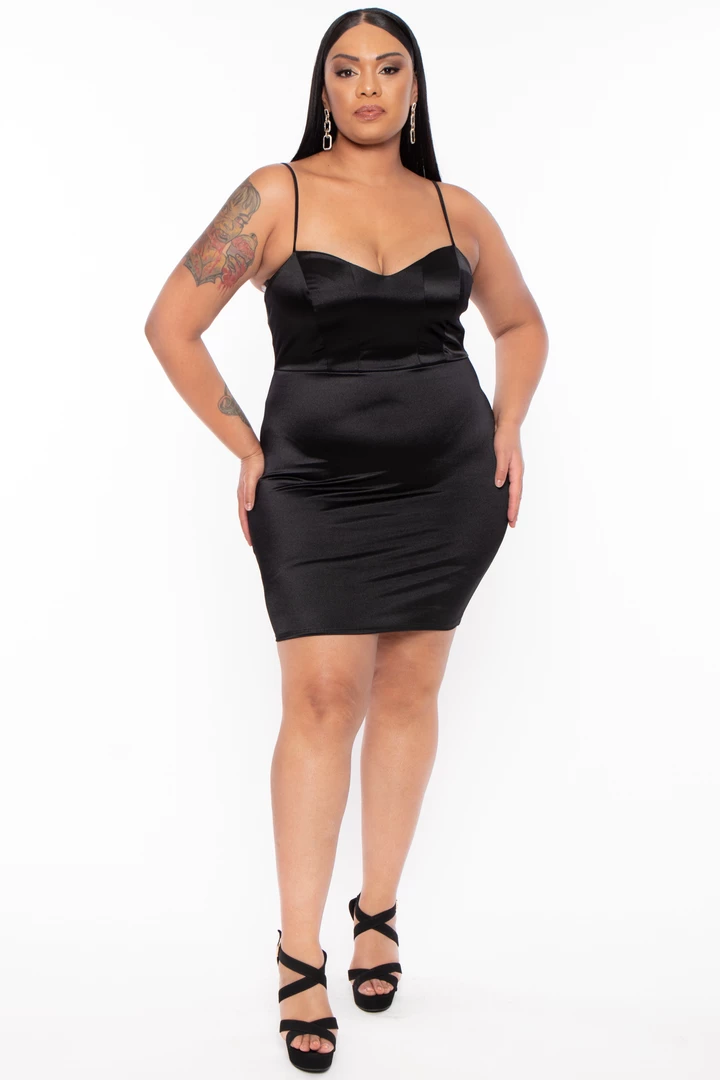 This plus size stretch dress features a beautiful satin material, a sweetheart neckline, adjustable spaghetti straps, and a bodycon mini length sillouhete.