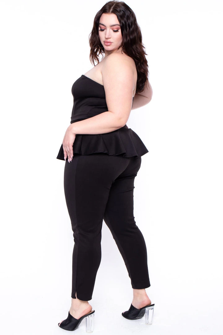 This plus size, stretch knit jumpsuit features an elastic V-neckline with added wire for extra comfort, princess seams, a banded elastic waist, peplum detail at waist, and a skinny leg.