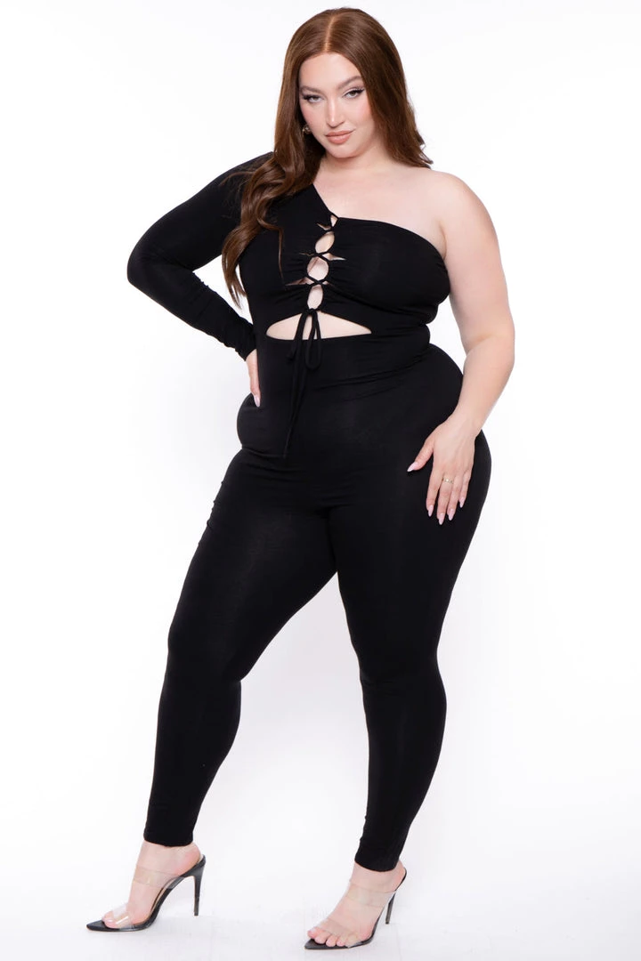 This plus size, jumpsuit features an asymmetric one shoulder neckline, sexy front cut out details and curve hugging silhouette