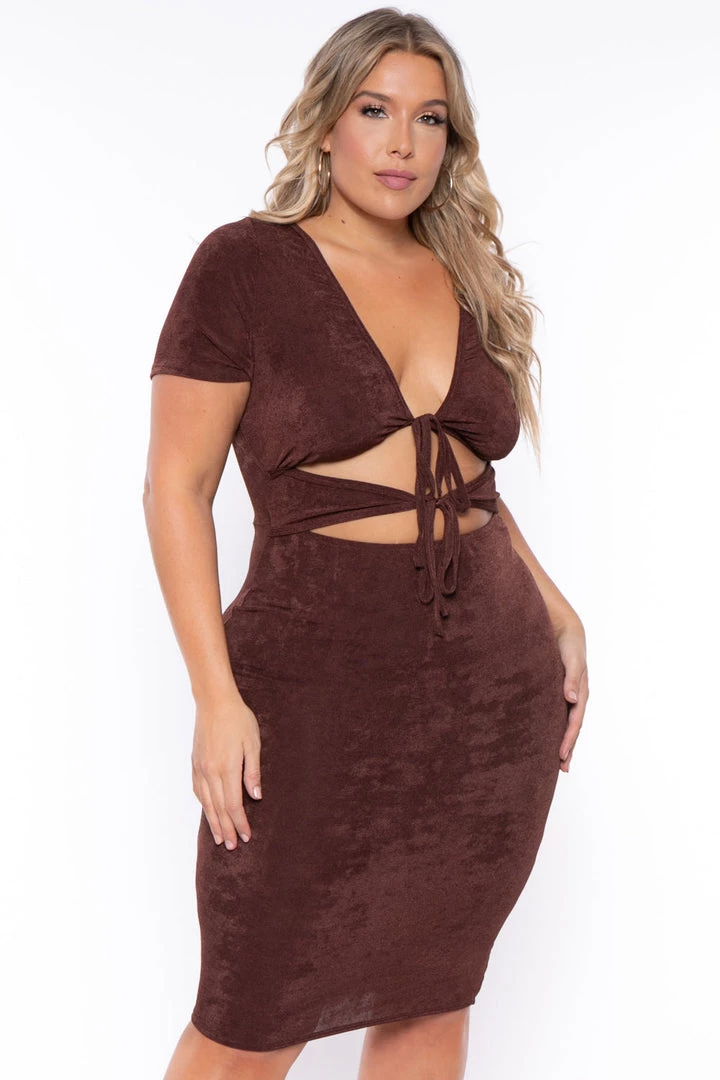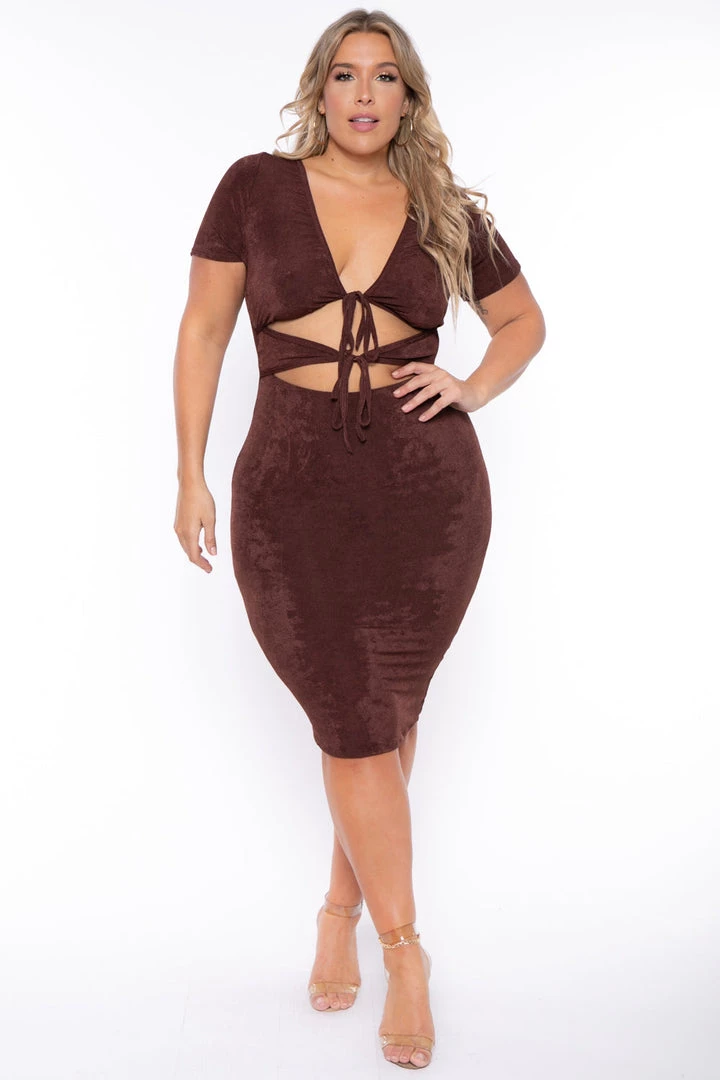 This plus size, dress features a curve hugging silhouette, front cut outs with tie closure, and soft slinky material that is so sexy