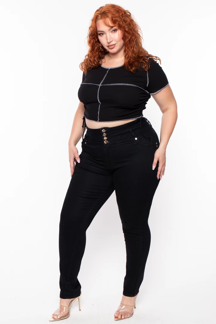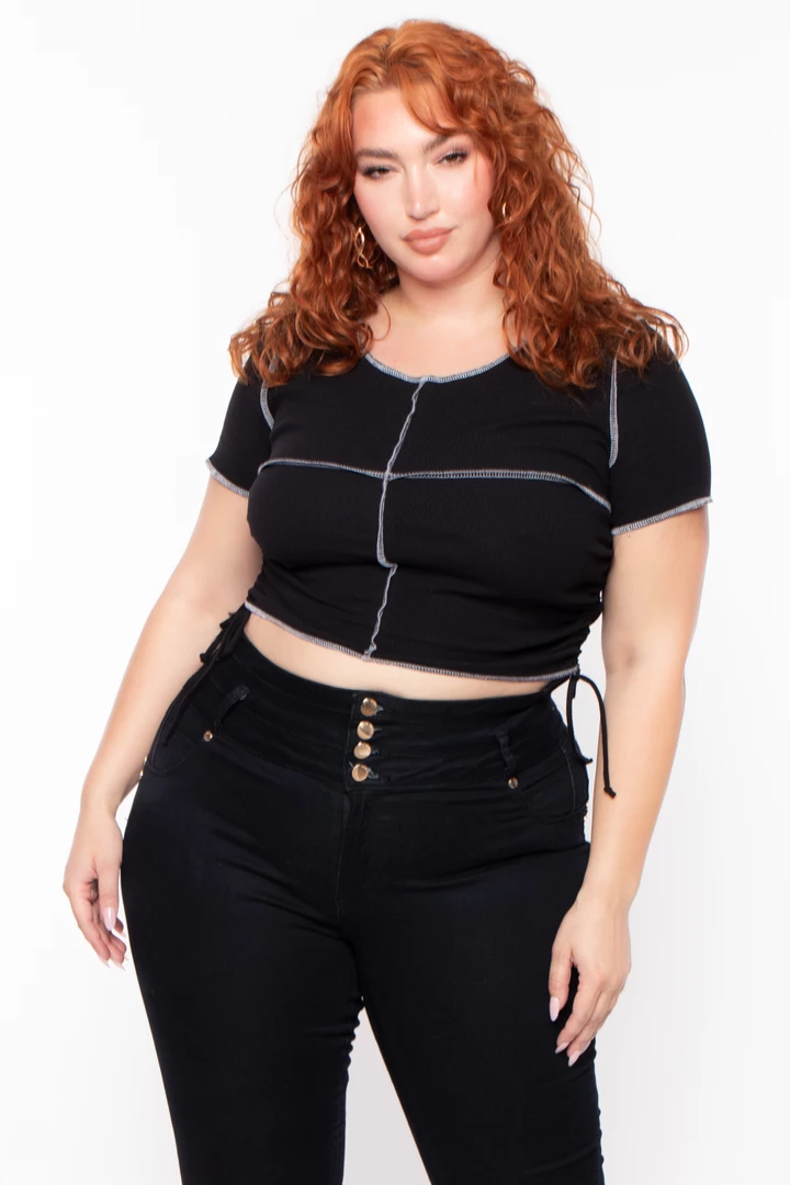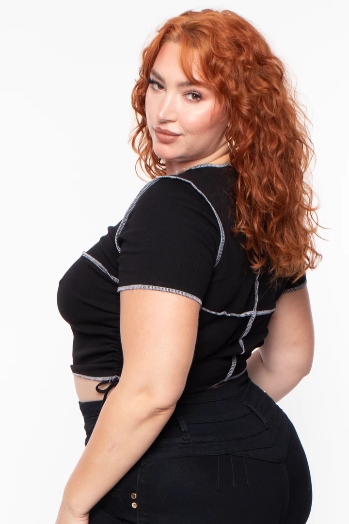 This plus size, casual top is perfect to pair with some jeans. Adria features adjustable side ruching details, cross shaped overlock hem detailing and short sleeves