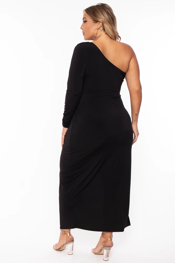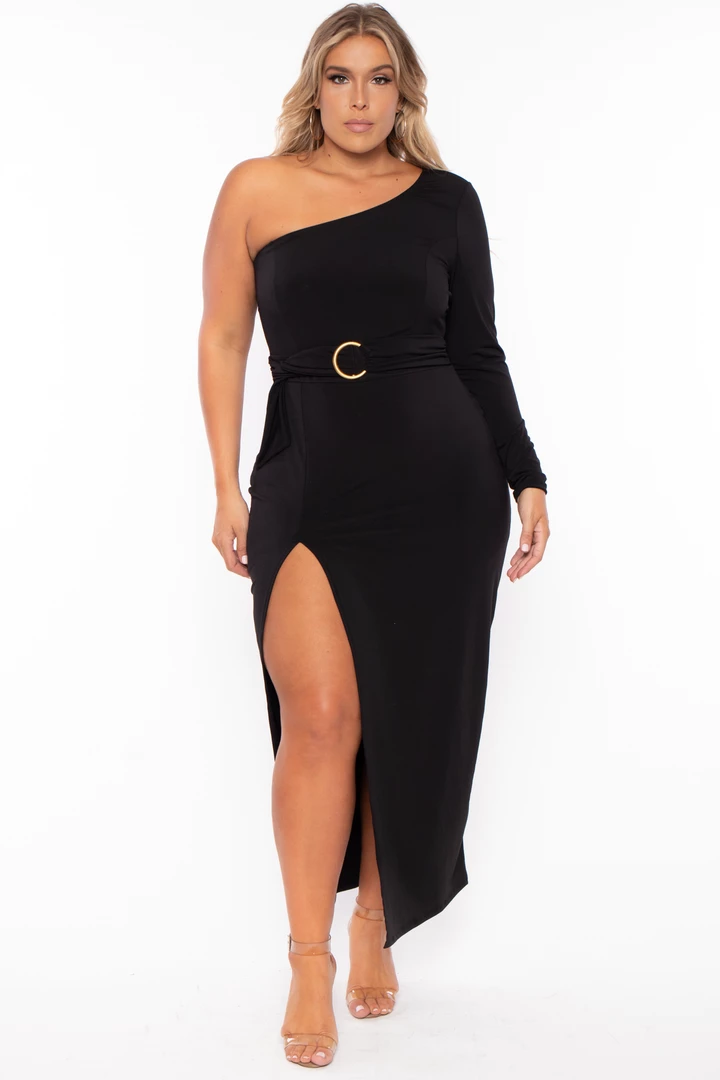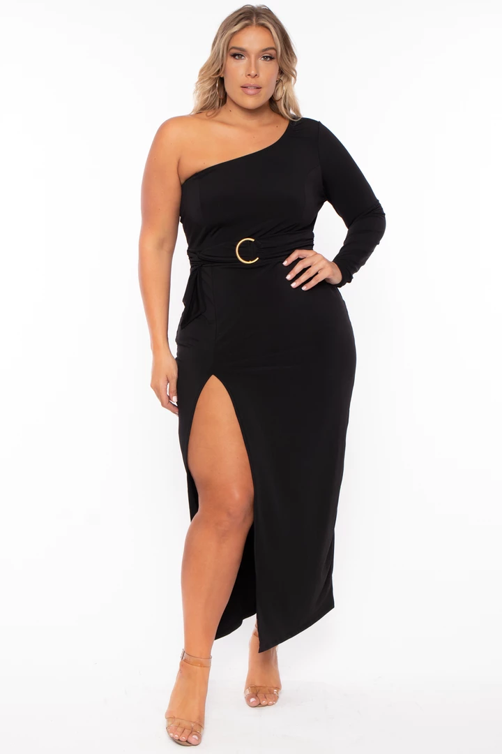 This plus size stretch knit dress features an elasticized sleeveless one shoulder design, one long fitted sleeve, an attached self tie belt with gold o-ring detail, a sexy high side slit, and a fitted maxi length sillouhete.