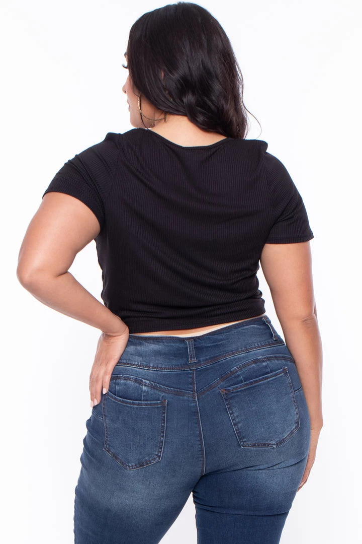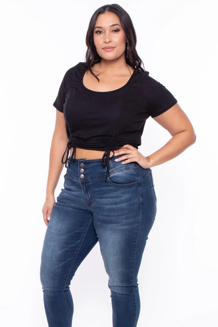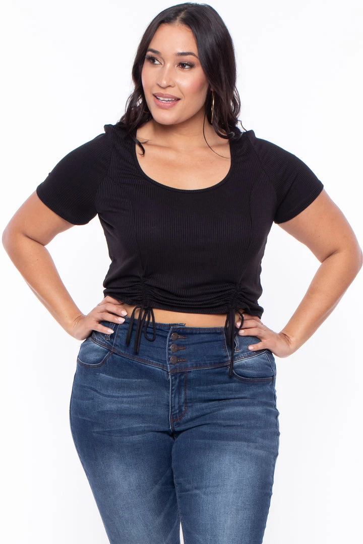 This plus size, stretch top features a crop top with a scoop neckline short sleeves, and front dual ruched hem detail that can be adjusted, this ribbed fabric is very comfy