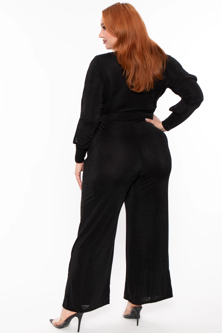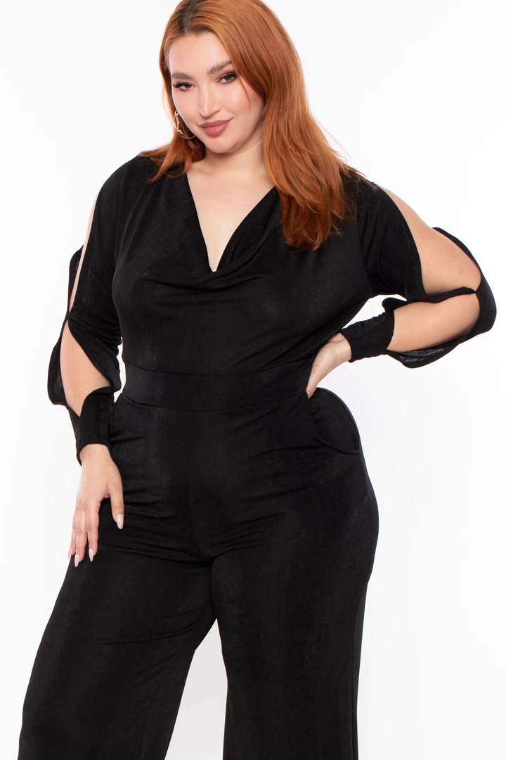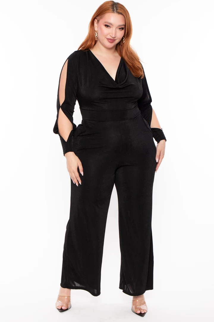 This plus size stretch knit slinky jumpsuit features a cowl neckline, long sleeves with spilt detail, side pockets, and a flared leg.