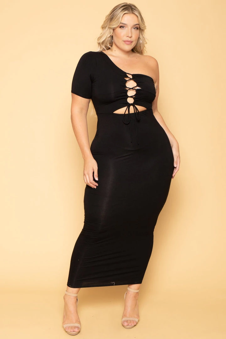 This plus size, maxi bodycon dress features an asymmetrical one shoulder neckline, curve hugging silhouette and sexy front cut out design with adjustable ties
