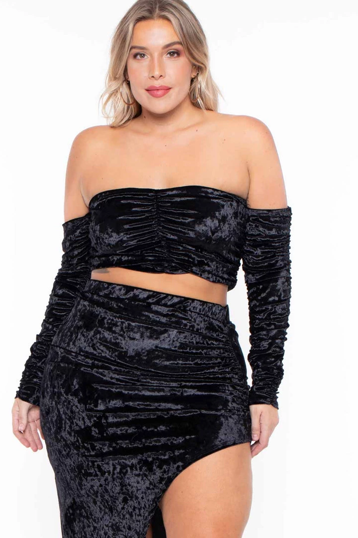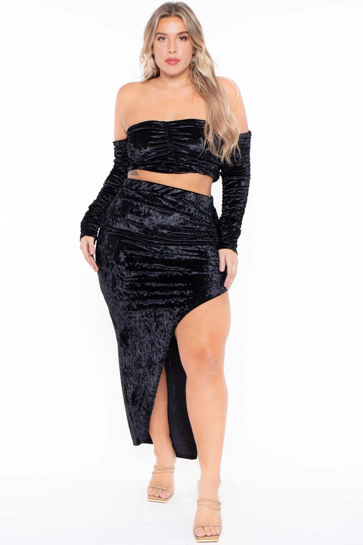This plus size velour matching set features a strapless neckline, attached long sleeves, and cropped hem with front ruched detail, as well as a long asymmetrical cut skirt with a slit to the front hem giving a very sexy bodycon silhouetteÂ