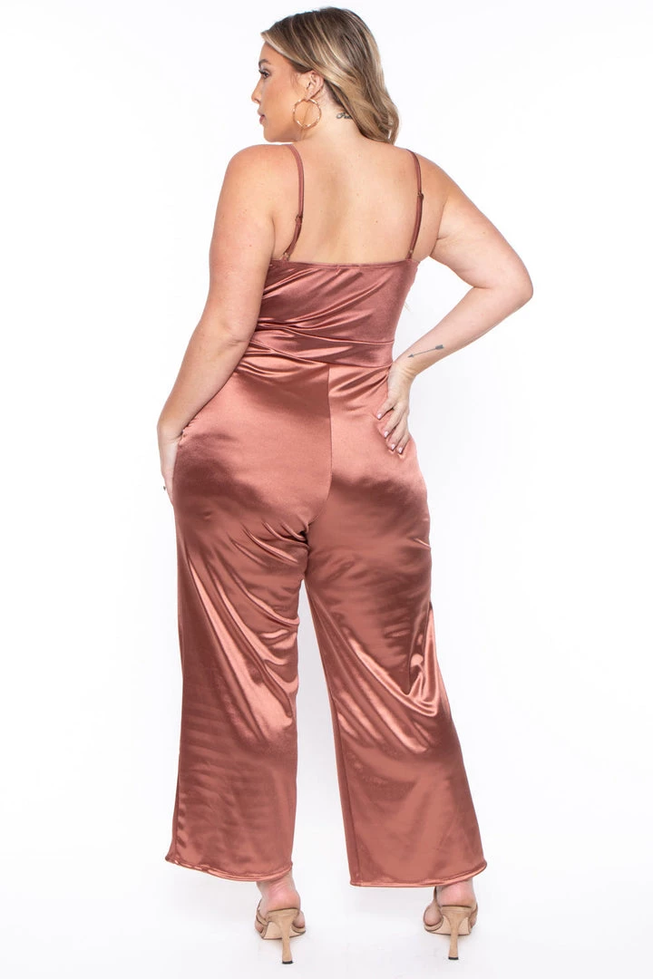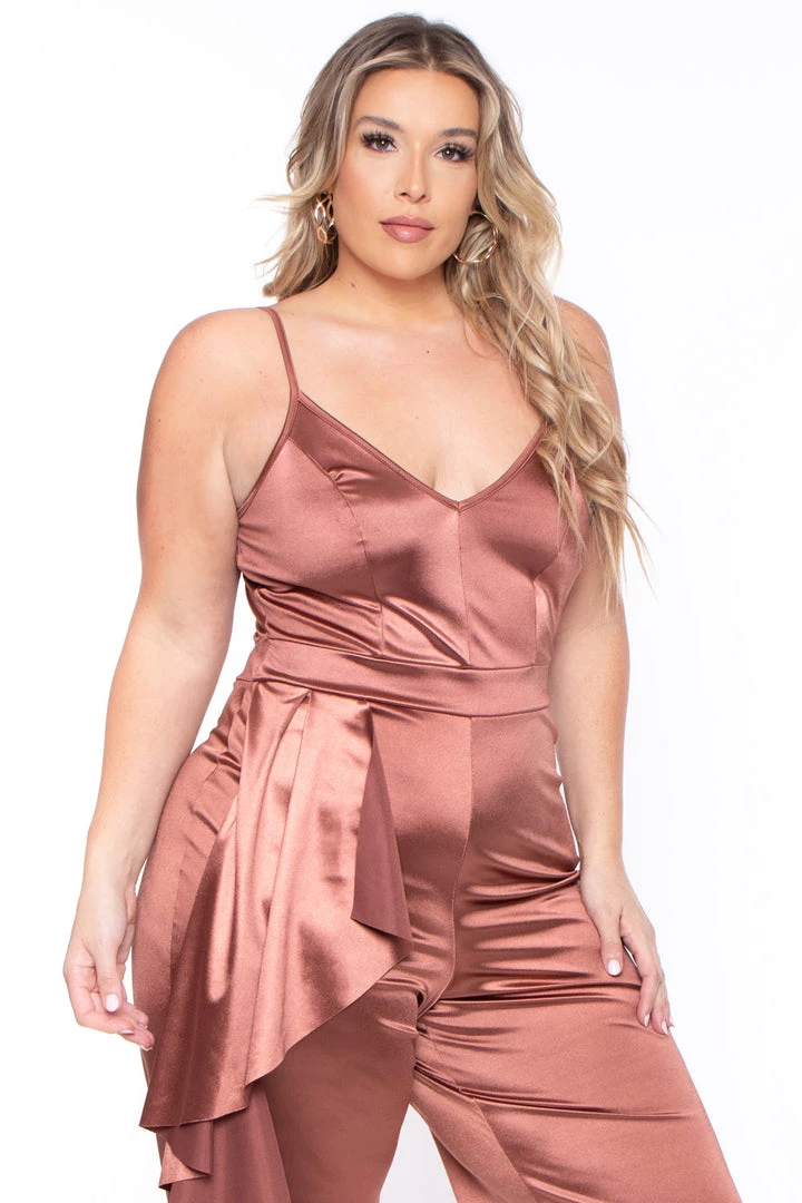 This plus size, jumpsuit features gorgeous shine and slips over your curves, low v neckline, accentuated waist, asymmetrical ruffled detail for a fun flare