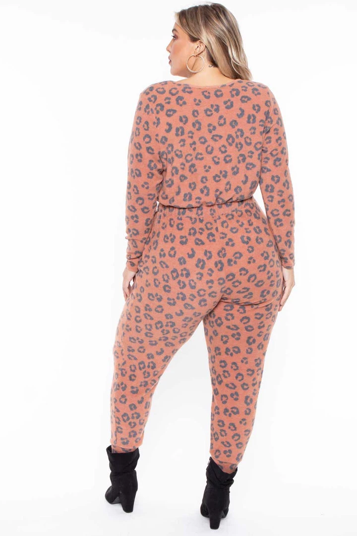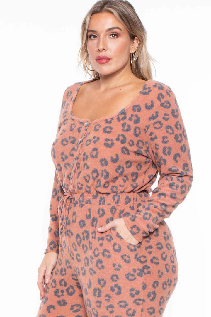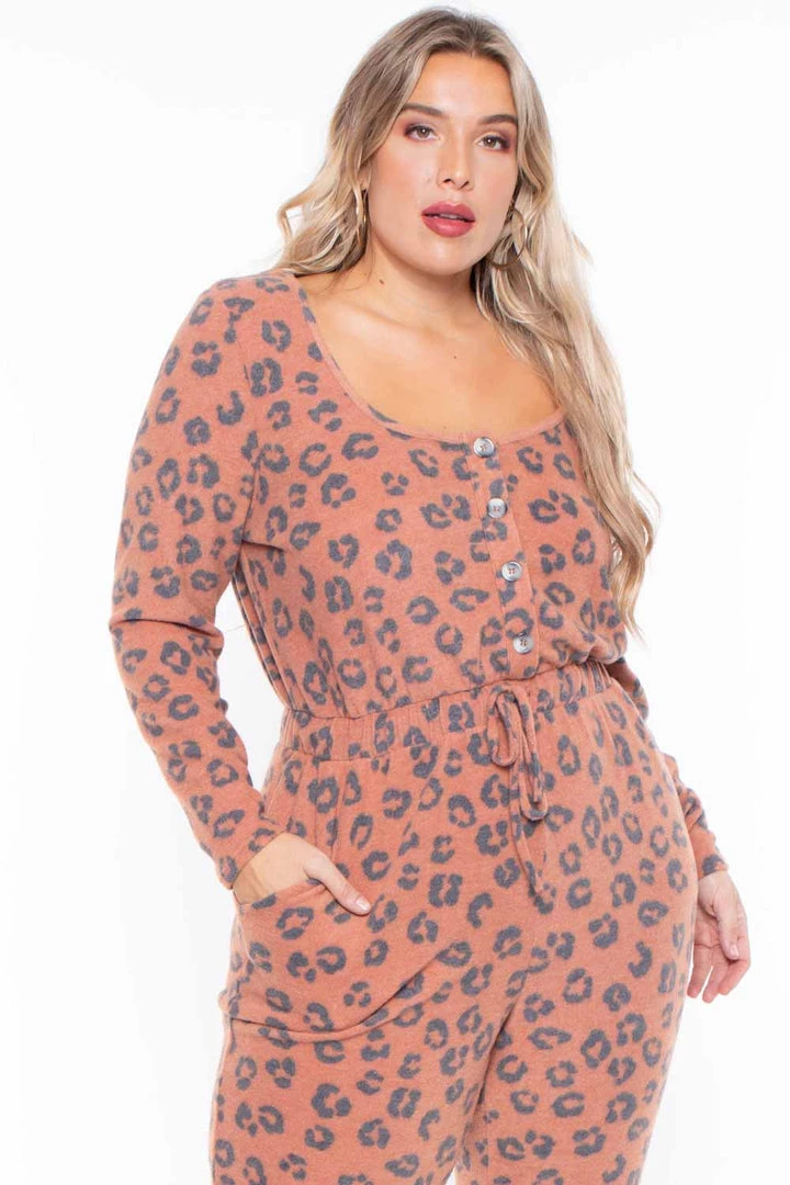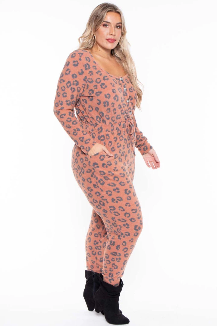 This plus size, stretch brushed fleece knit jumpsuit features a square button front neckline with elastic waist for better shape and support, long sleeves, side pockets, self banded hem, and a relaxed fit. Super cozy & comfy.