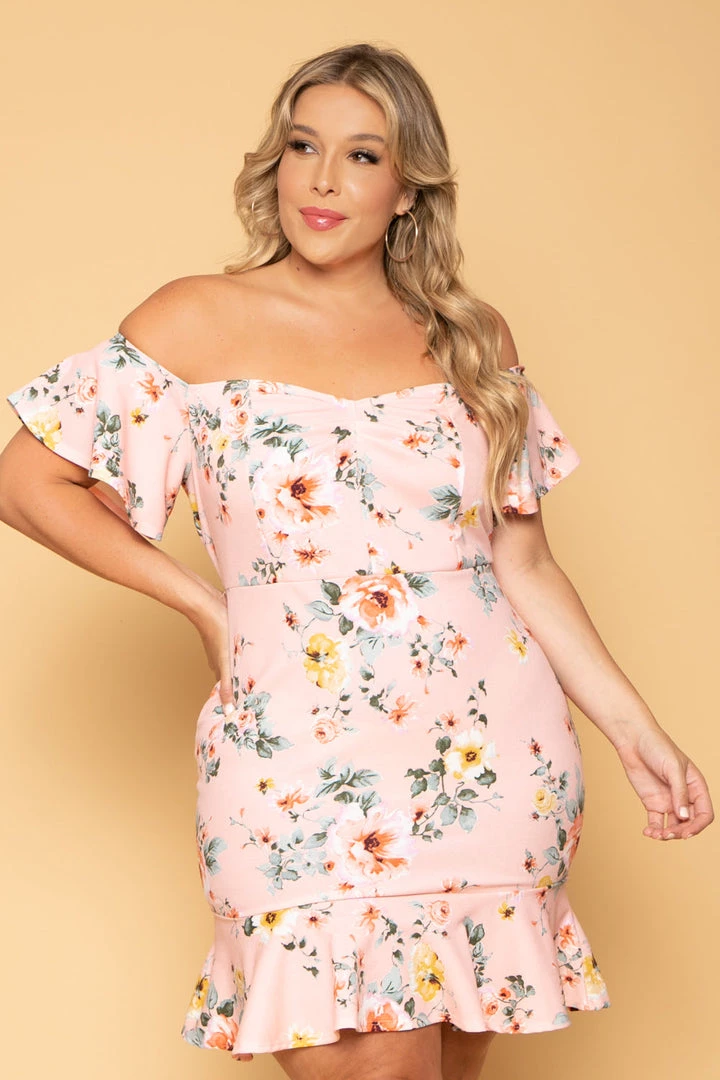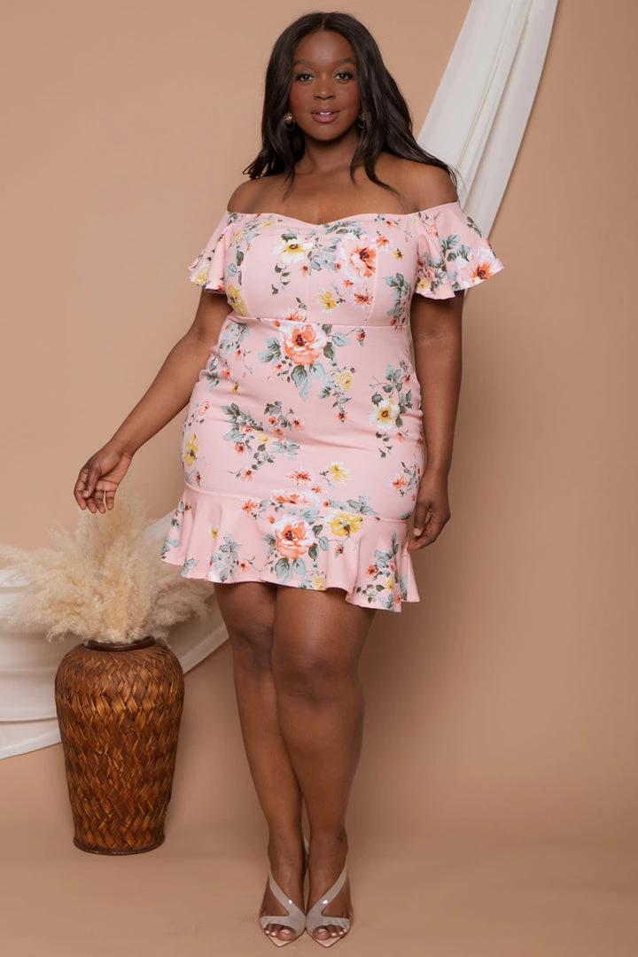 This plus size, off the shoulder dress features a bold and colorful floral print with a curve hugging silhouette, ruffled bottom hem and subtle sweetheart neckline
