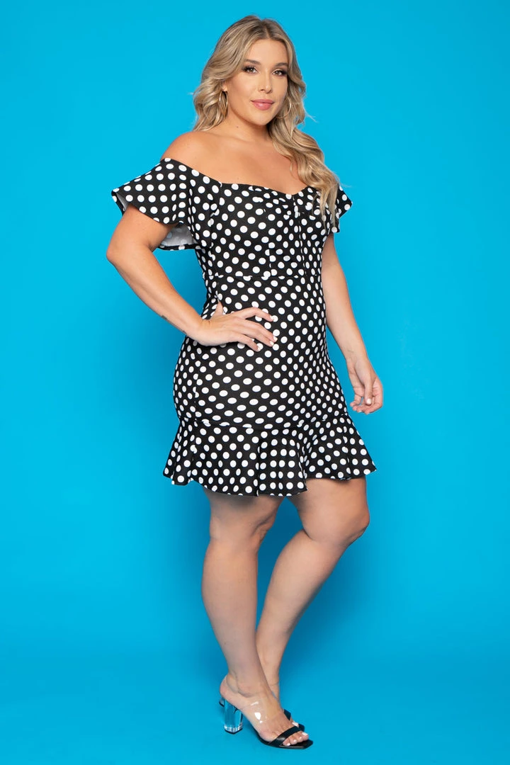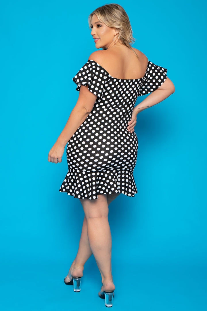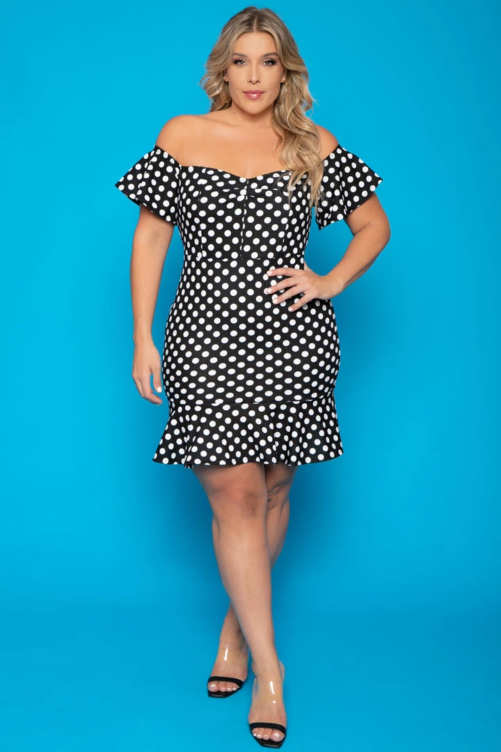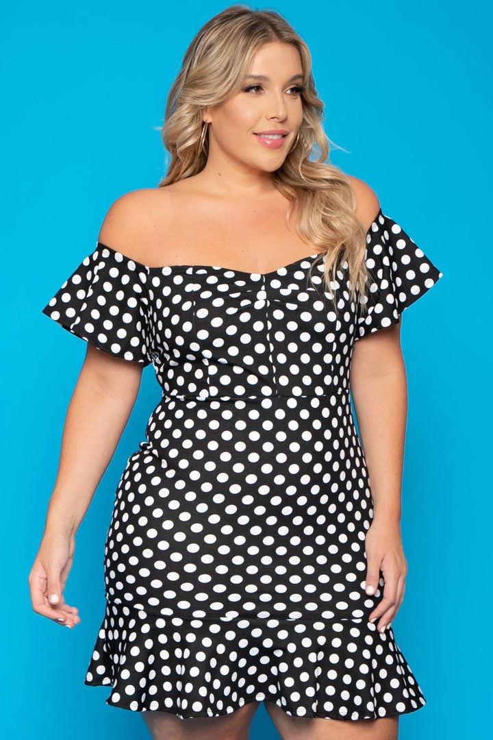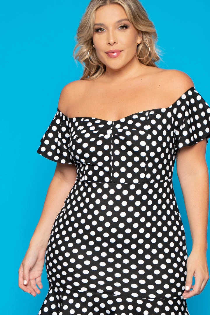 This plus size, off the shoulder dress features a classic polka dot print with a curve hugging silhouette, ruffled bottom hem and subtle sweetheart neckline