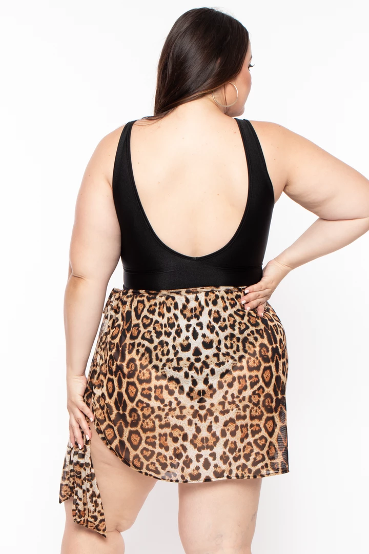 This plus size, stretch knit mini wrap skirt features a self waistband turning into a self-belt wrap-around style and asymmetric hem