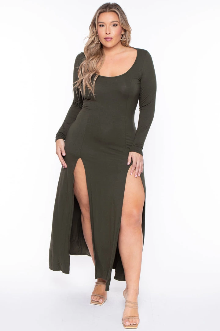 This plus size, stretch knit dress features a scoop neckline, long sleeves, princess seams, and a dramatic front M-slit.