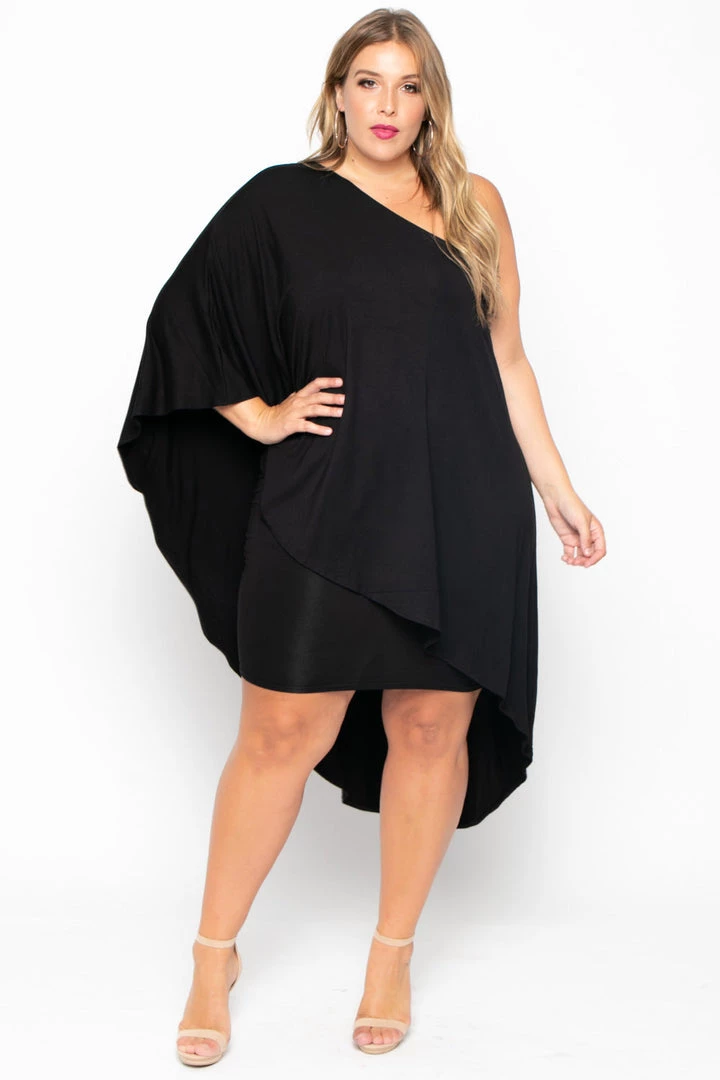 This plus size, stretch knit dress features a bodycon dress, and an attached asymmetric draped overlay.