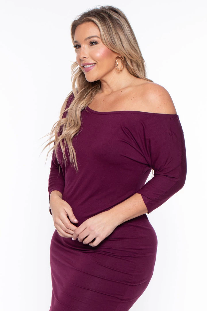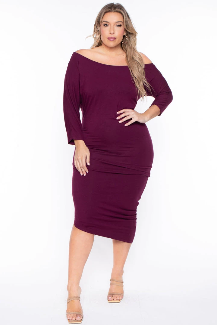 This plus size, stretch knit dress features a round off one shoulder neckline, 3/4 sleeves, an asymmetric hem, and a bodycon silhouette.