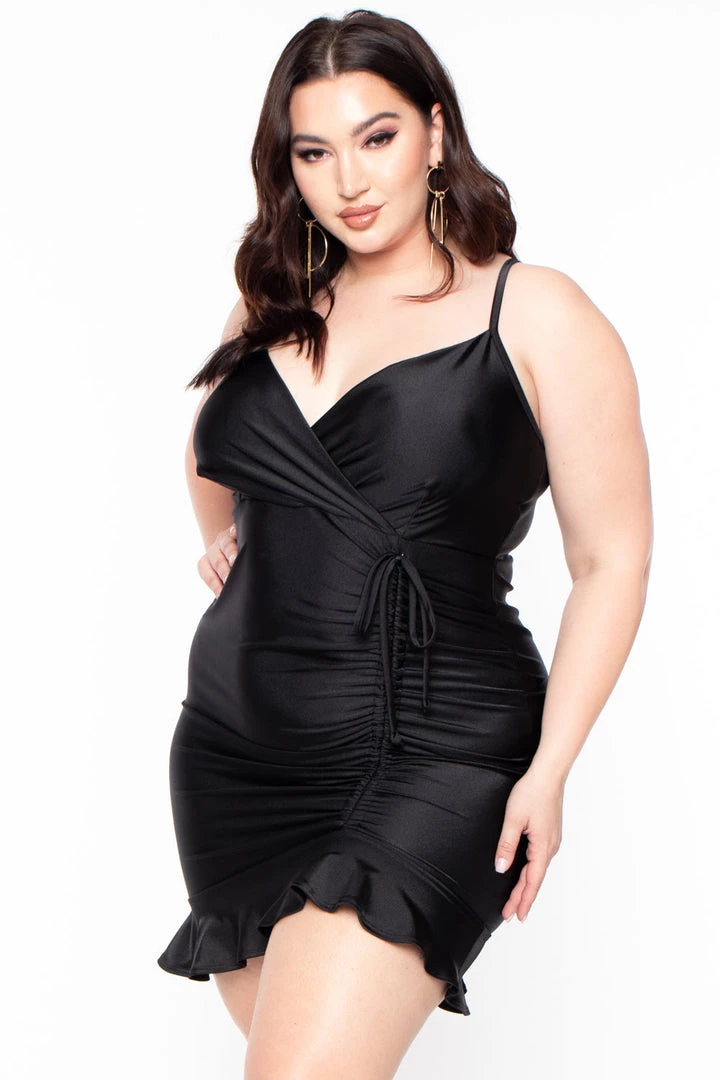 This plus size, stretch knit high sheen dress features a plunging surplice neckline, adjustable cami straps, a channel ruching lace up detail, ruffled hem, and curve-hugging silhouette,