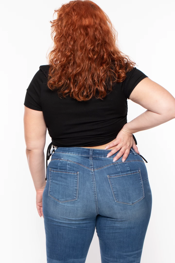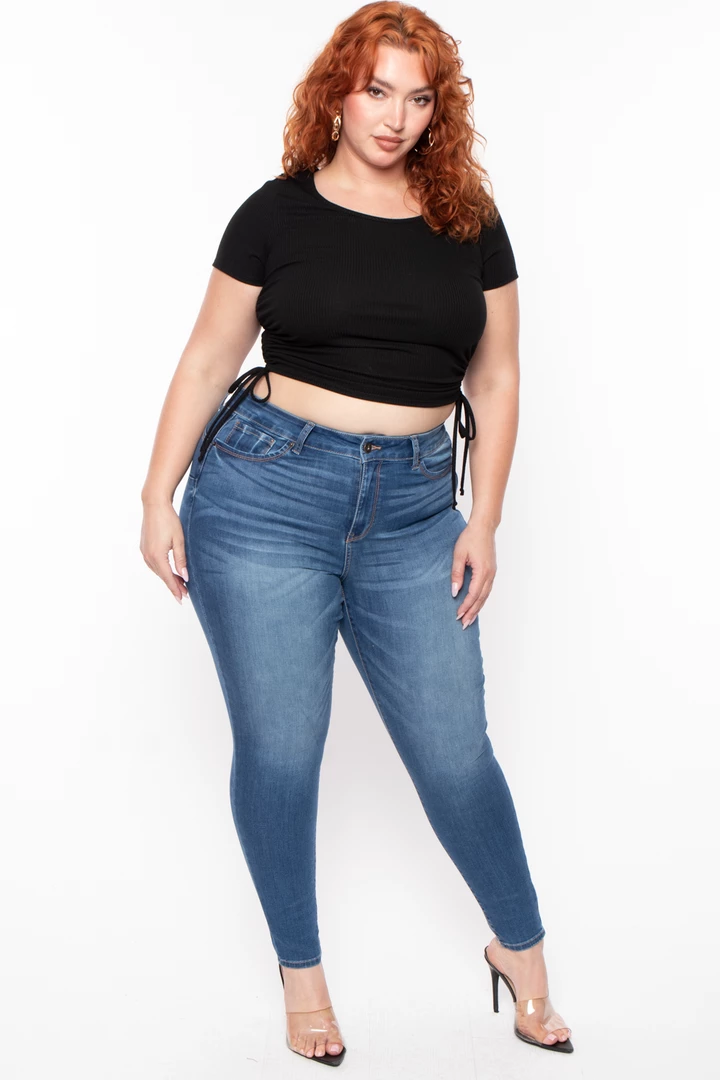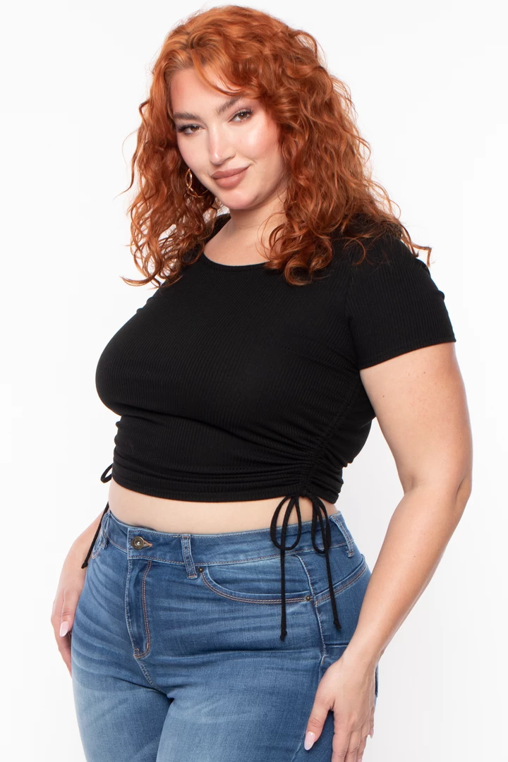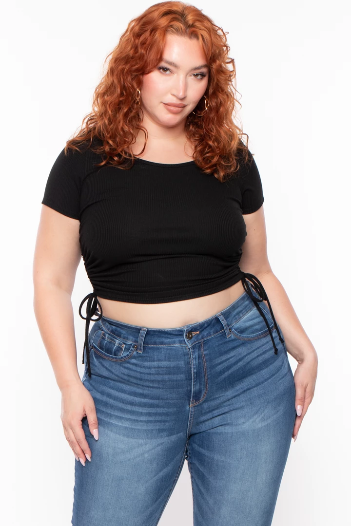 This plus size stretch top features a crew neckline, short sleeves, side ruched hem drawstrings that can be adjusted, and a cropped fit. Complete the look with high waist leggings or jeans.